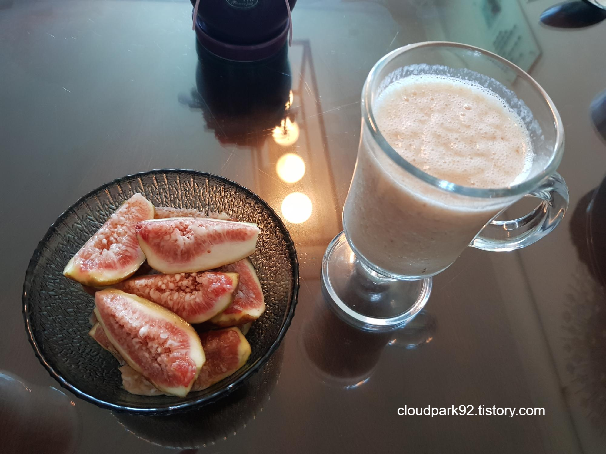 요구르트를 넣어 갈은 새콤달콤한 무화과 주스도 먹고 과육으로도 먹고요 무화과는 너무 달지 않은 은근한 맛이 매력이에요