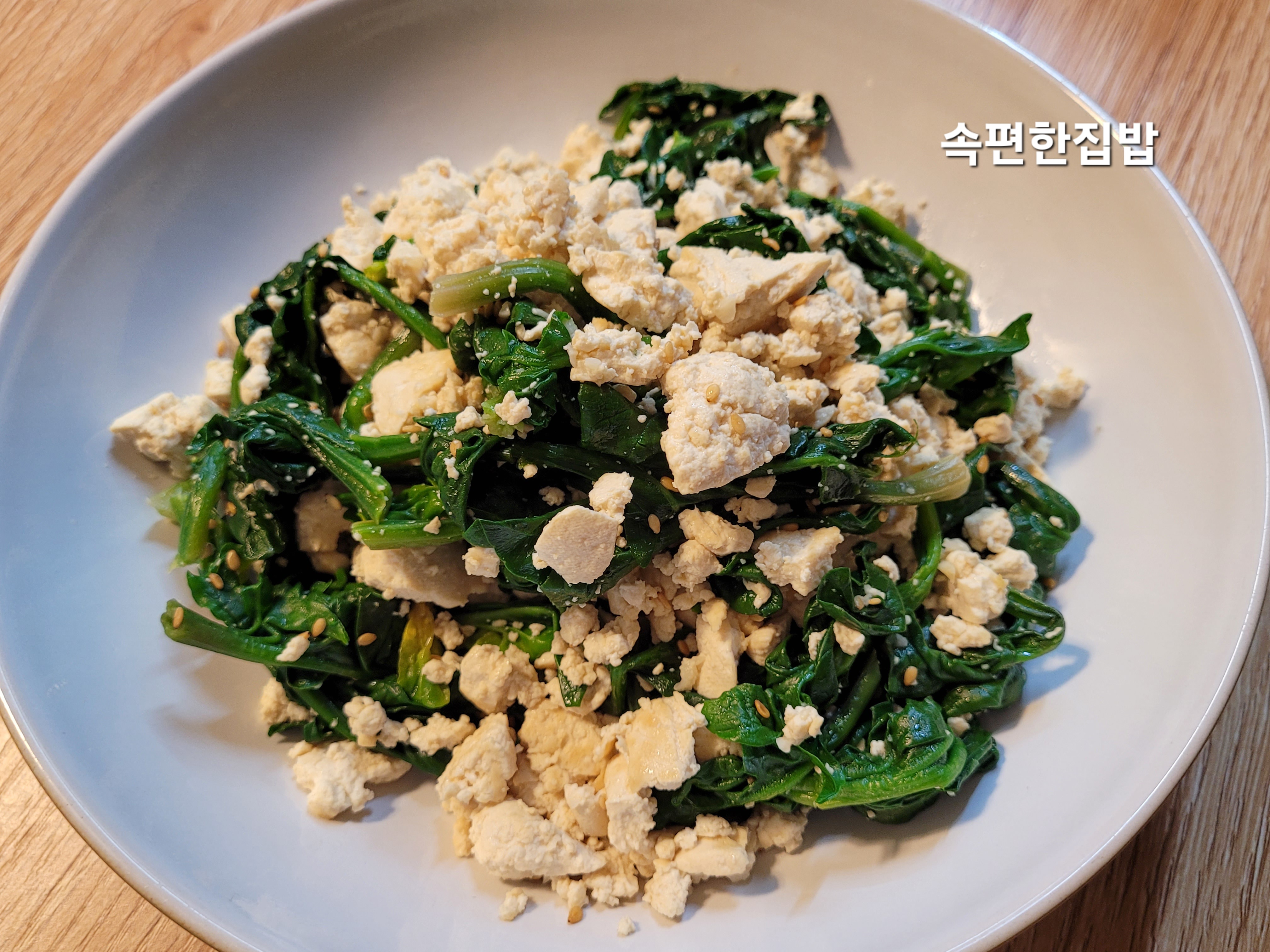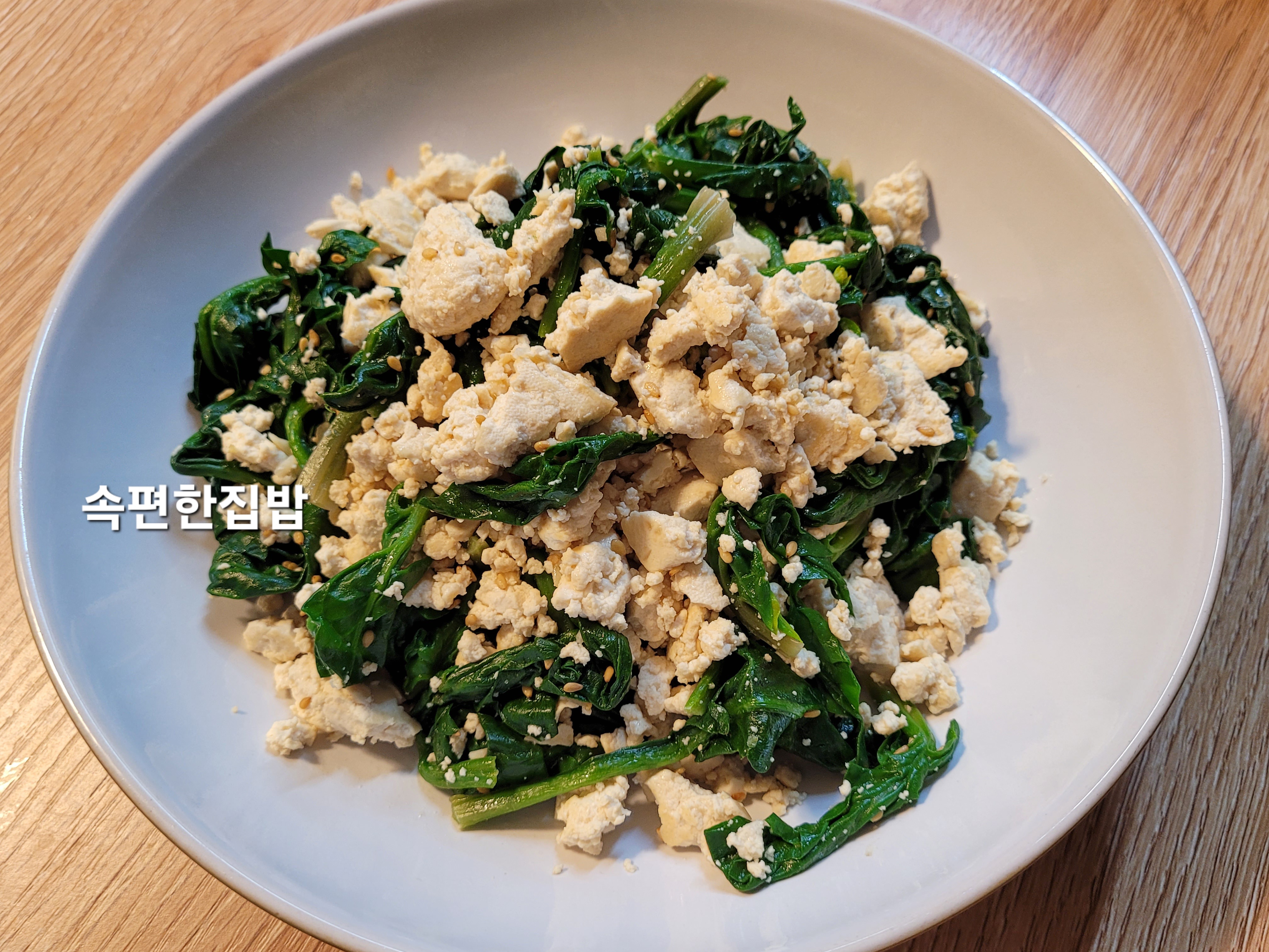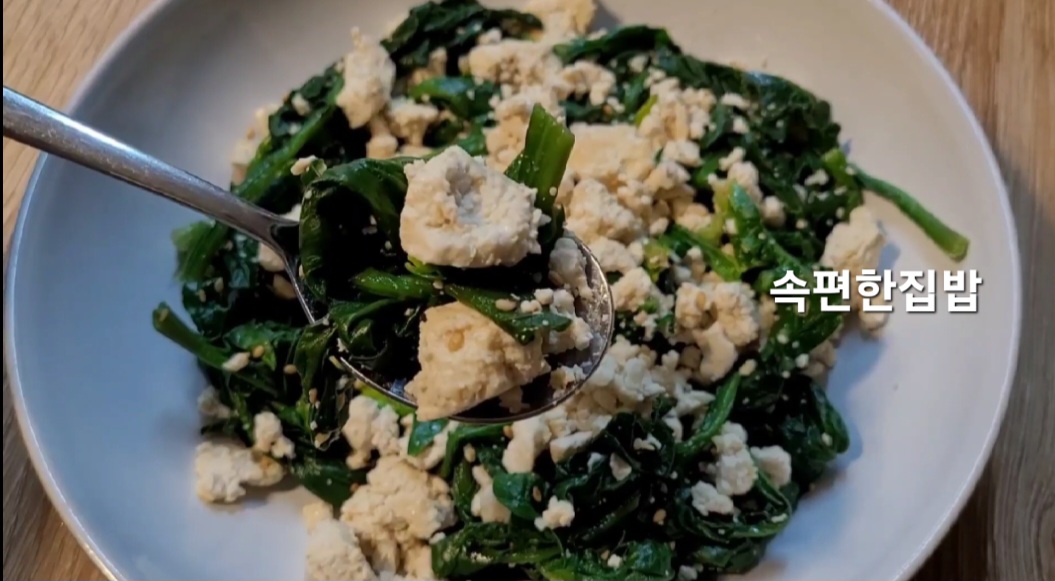 볶은 두부를 시금치와 살살 버무려 섞어 줍니다.