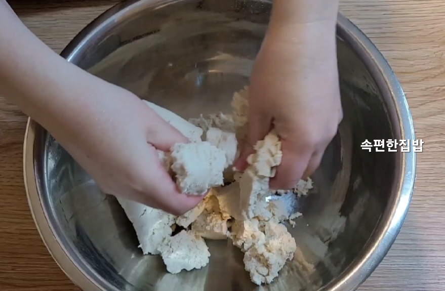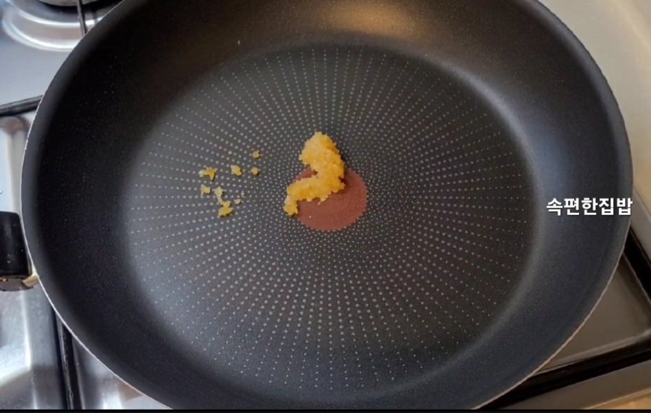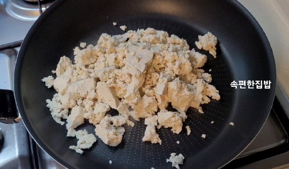 팬에 다진 마늘과 으깬 두부를 볶아줍니다.