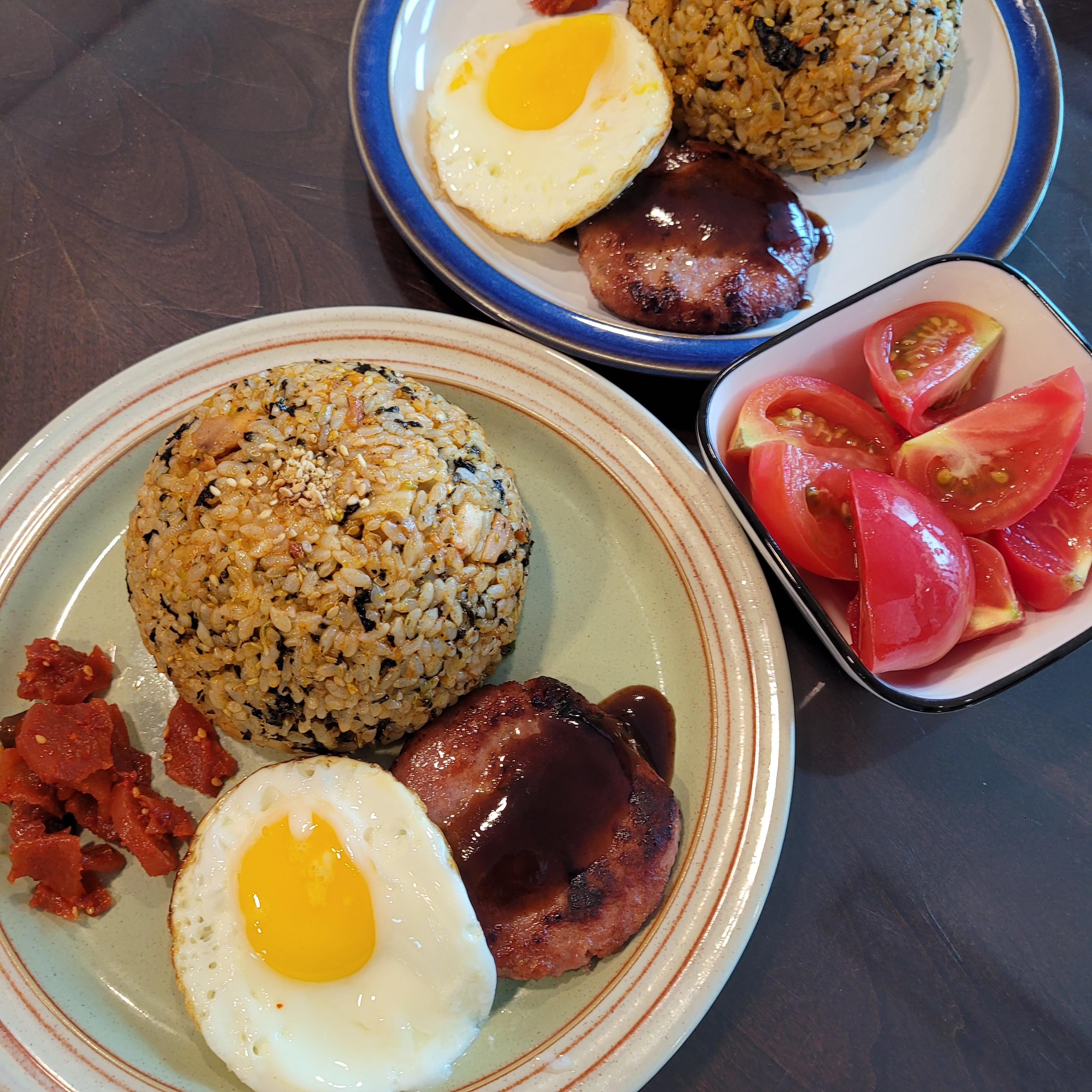 *떡갈비, 플레이크를 넣은 닭갈비 볶음밥, 계란프라이, 무장아찌, 절인 토마토