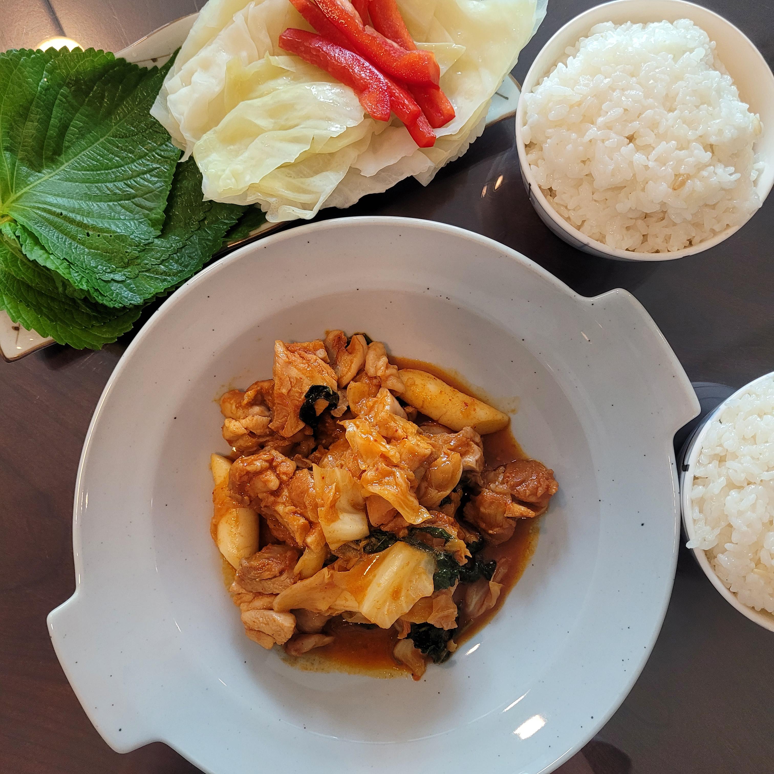 *닭갈비, 양배추 쌈, 깻잎, 파프리카