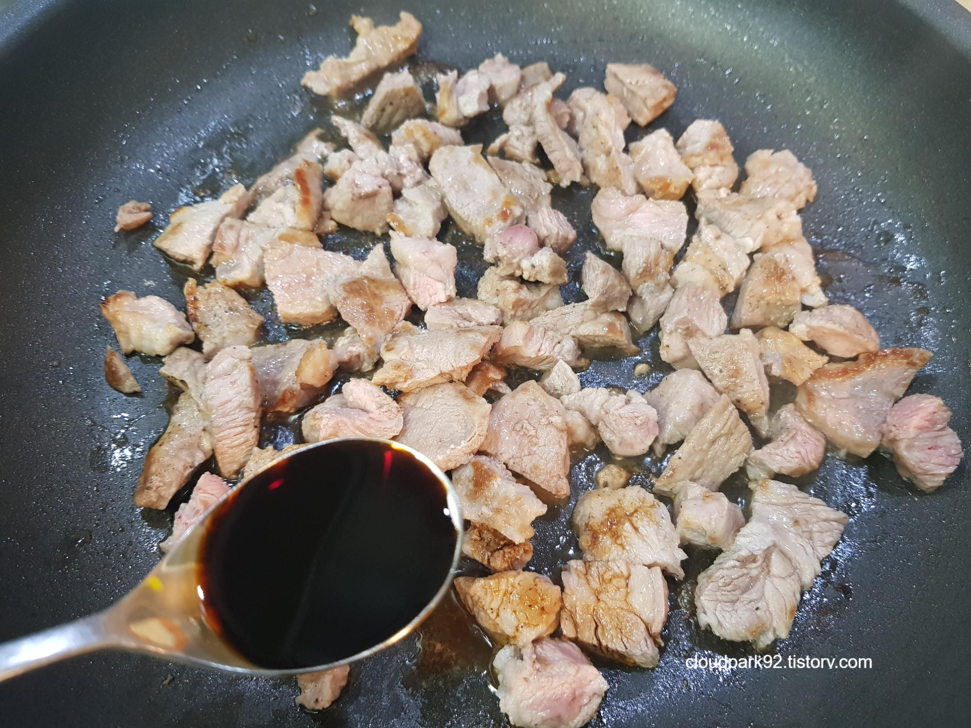 고기에 간이 배도록 간장을 살짝 넣을게요 저는 어린이용 작은 숟가락으로 반 숟가락 넣었어요