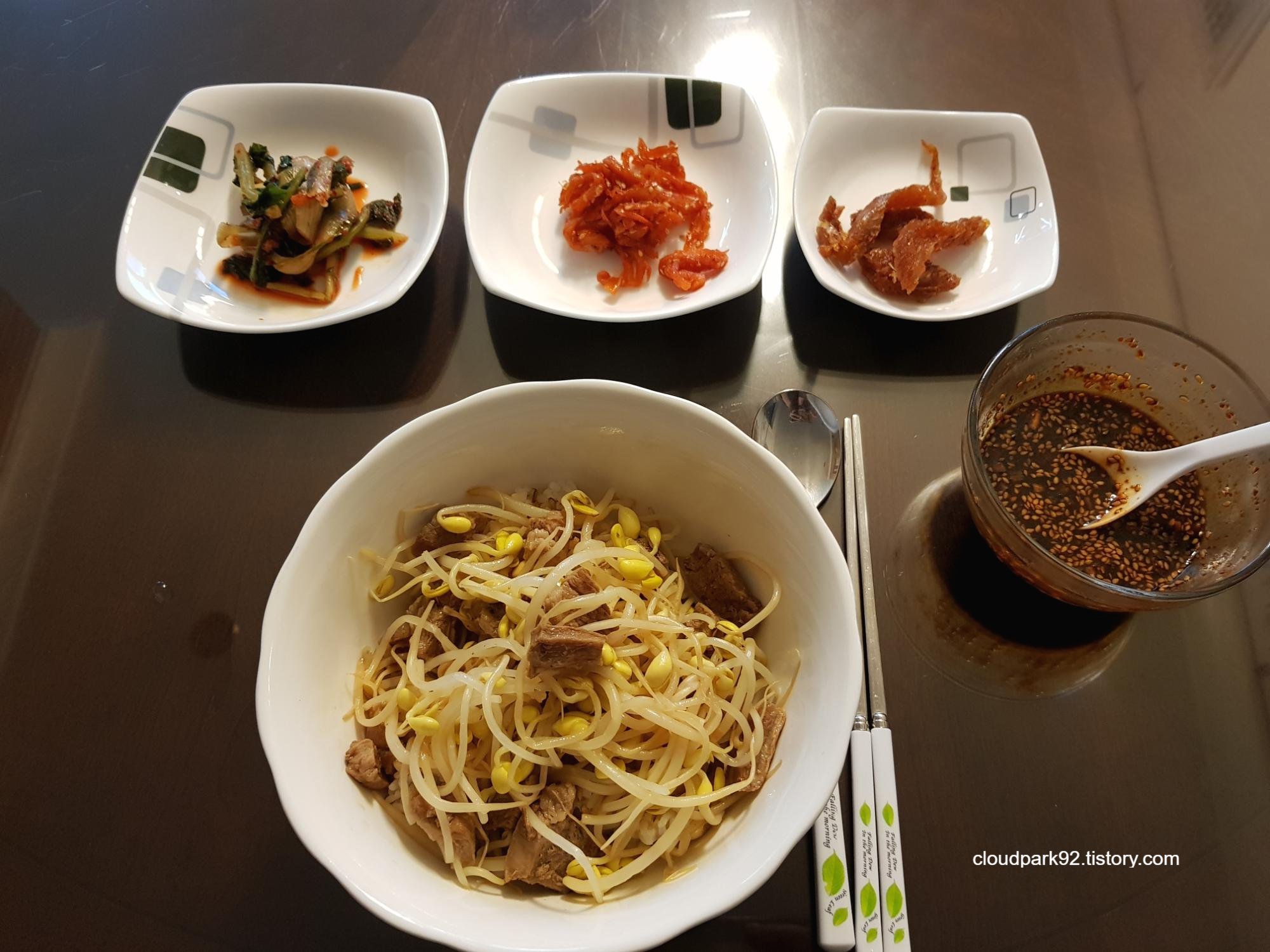 불을 끄고 잘 익은 콩나물과 고기를 살살 건져 올려서 밥 위에 사뿐히 얹으면 완성이에요