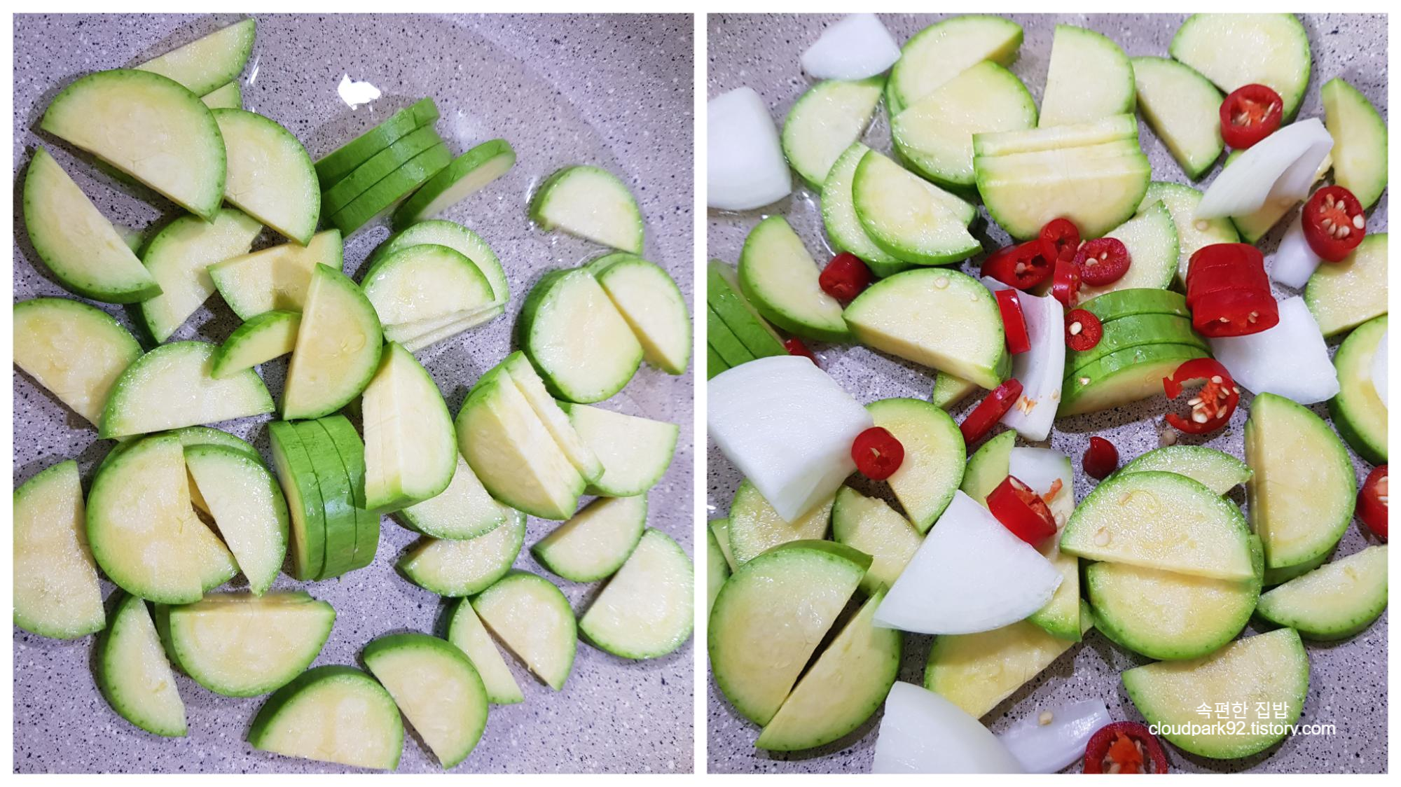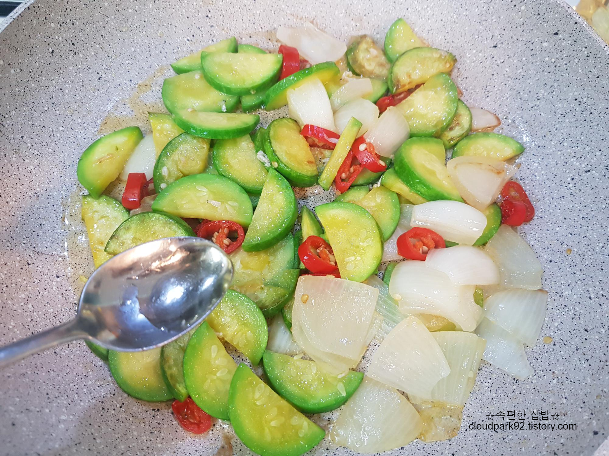 재료: 호박, 양파, 고추, 새우젓, 식용유, 올리고당