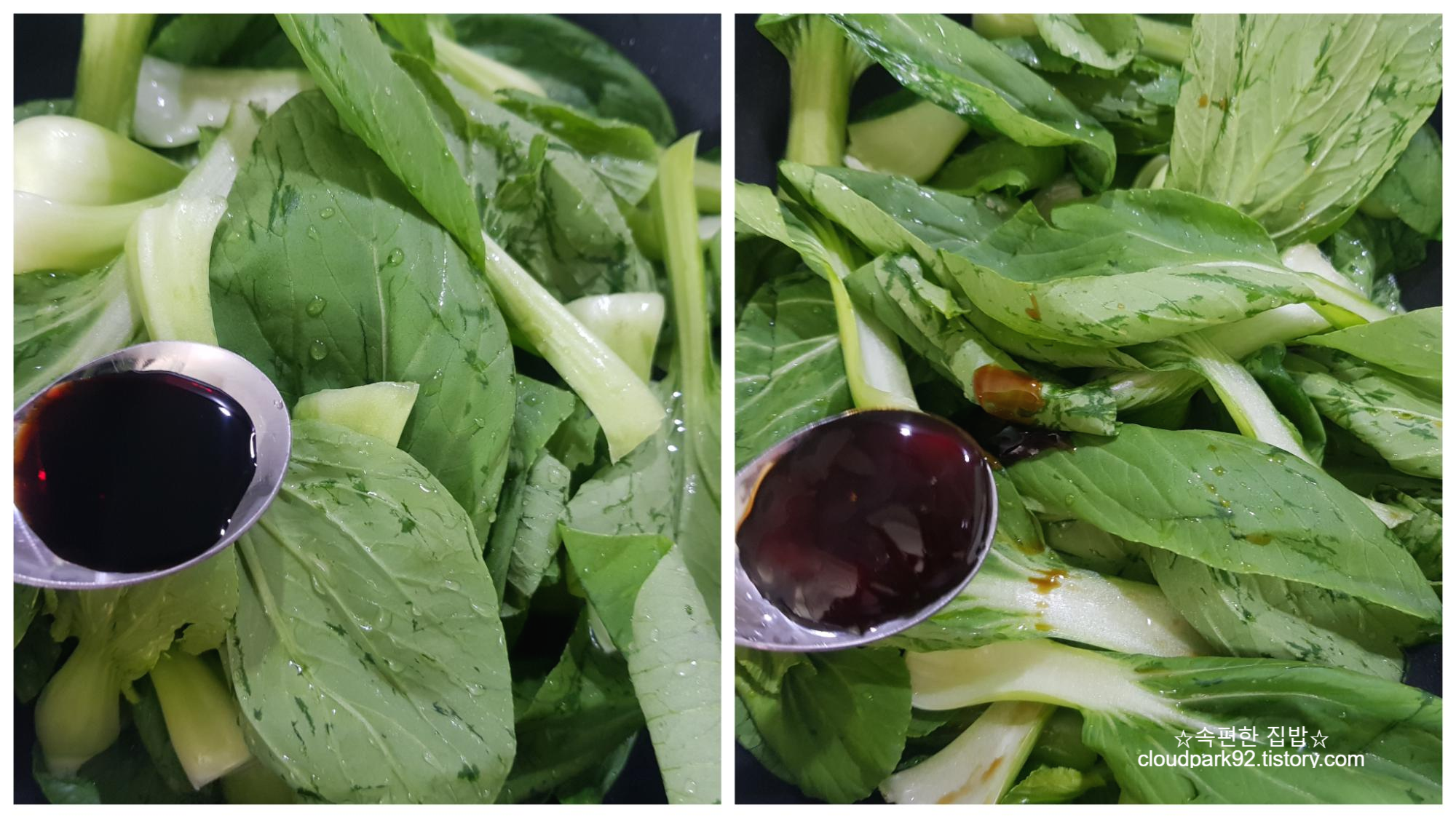 너무 끝까지 익힐 필요는 없고 어느 정도 이파리 숨이 죽었다 싶으면 불을 꺼도 돼요