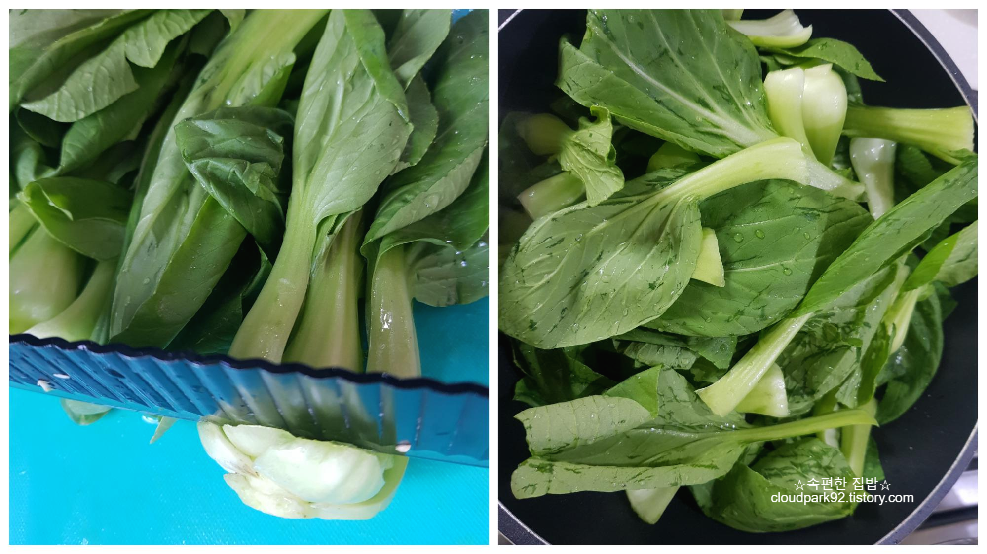 청경채 꼭지를 자르고 깨끗이 씻어요