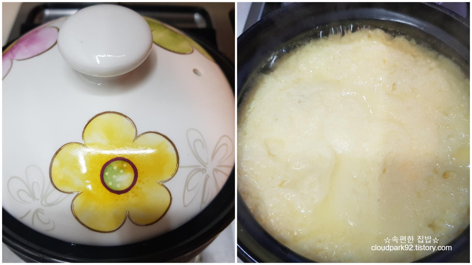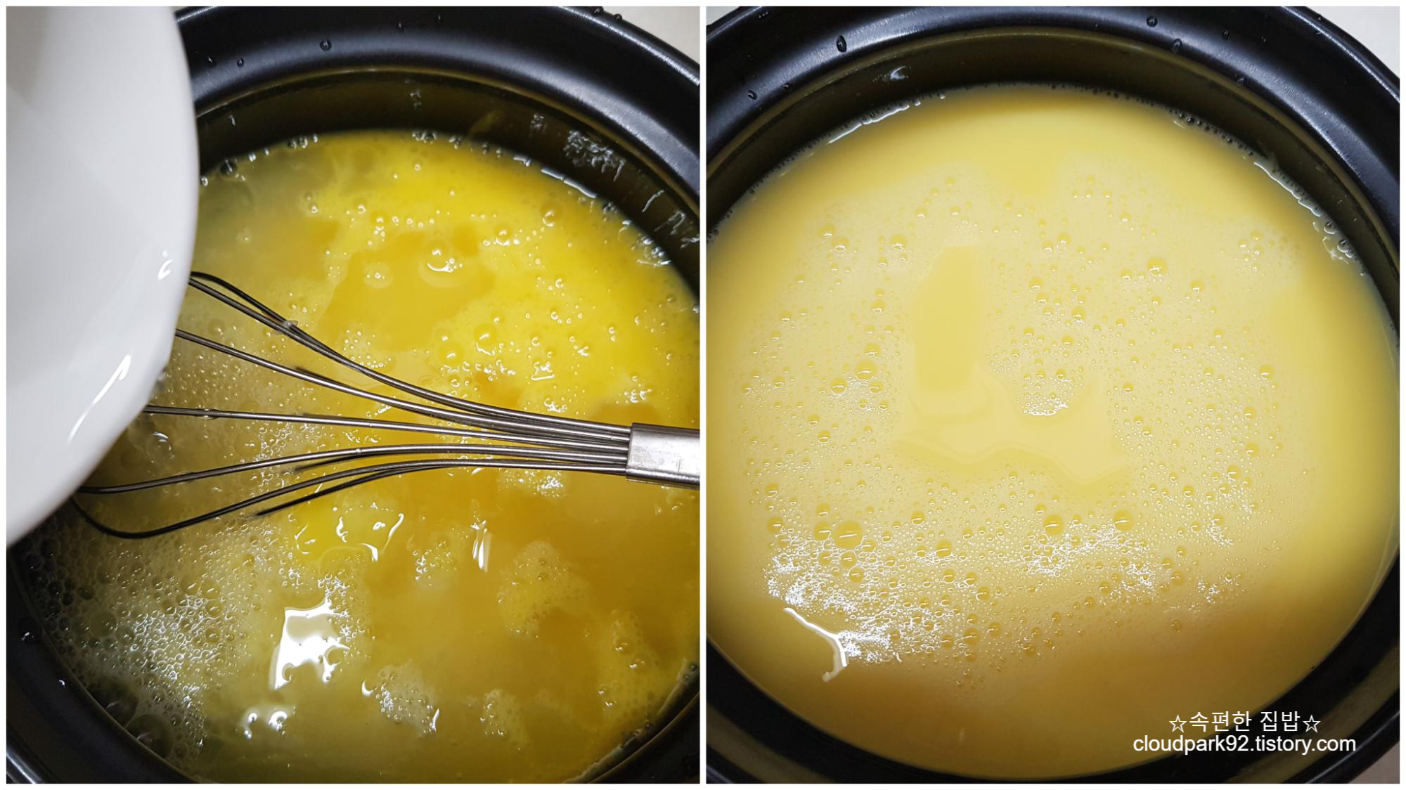 물이 적을수록 단단하게 응고된 계란찜이 되고 물을 많이 넣을수록 물기 많은 촉촉한 계란찜이 돼요