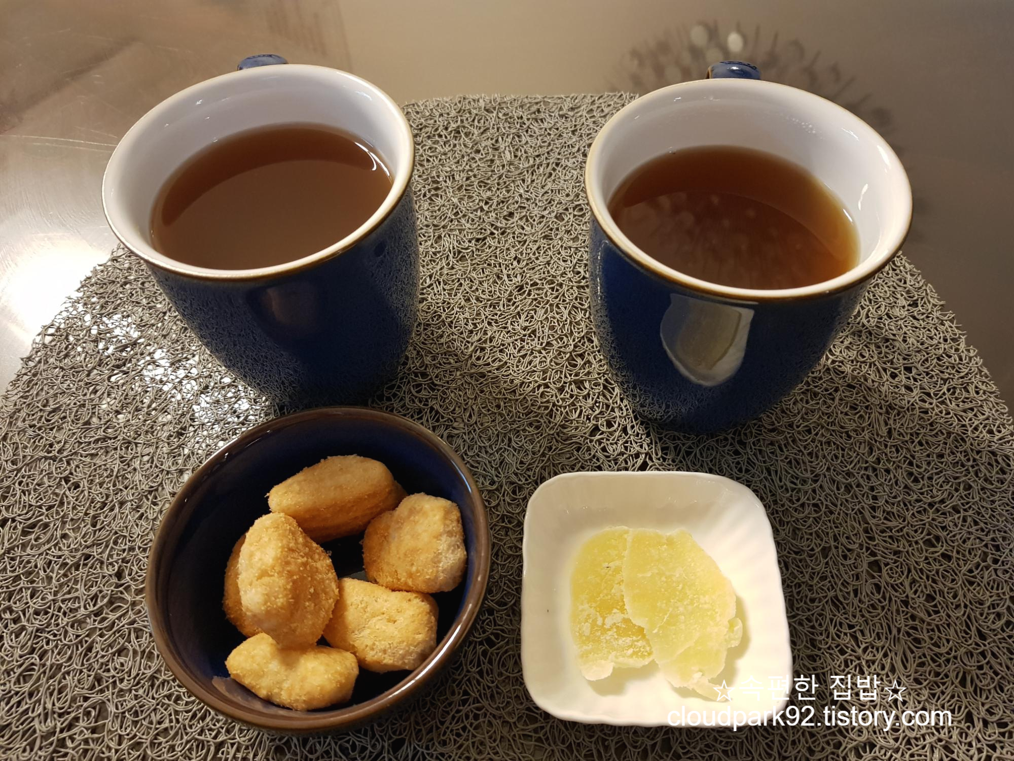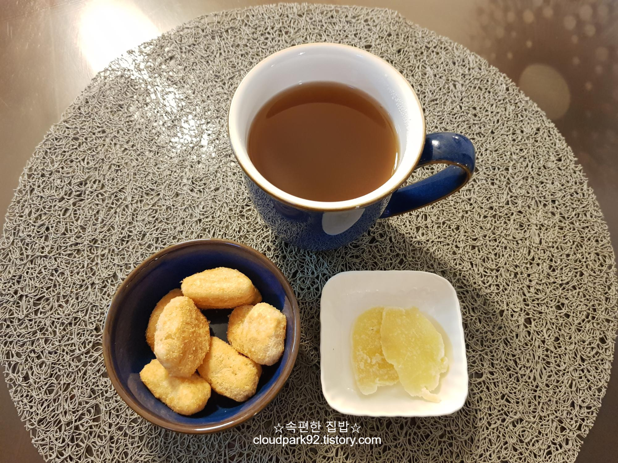 한약 먹고 사탕 먹는 거랑 반대죠? 생강의 매운맛을 잡아줄 정도로 꿀홍삼차가 달콤 쌉싸름하니 맛있어요