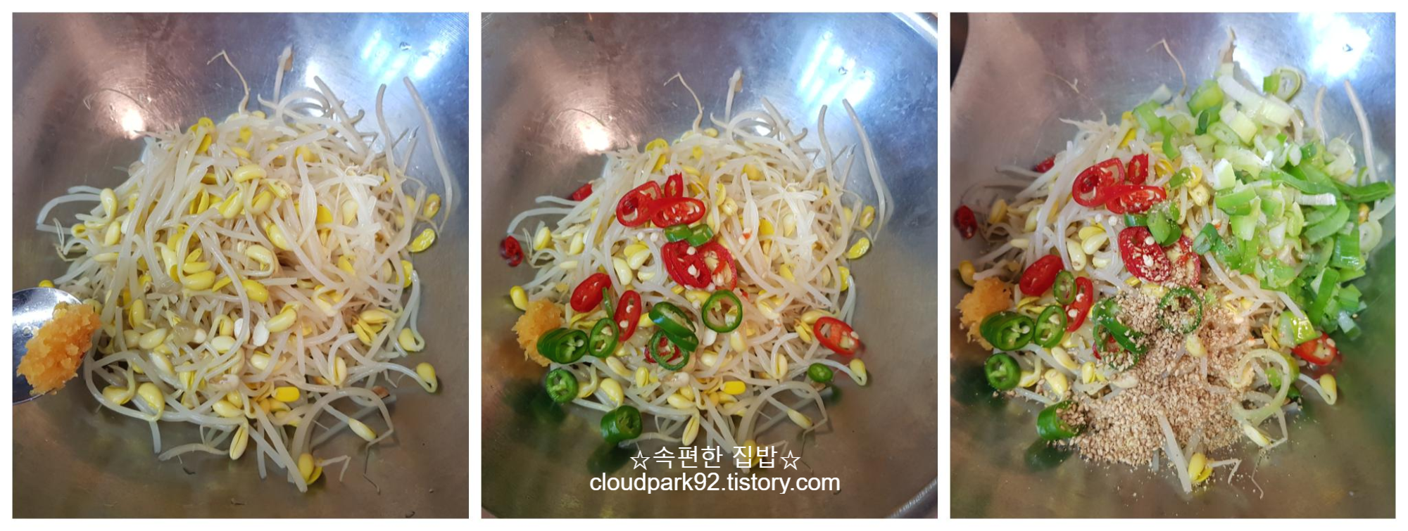 콩나물 무침 재료: 콩나물, 파, 마늘, 깨, 소금, 참기름