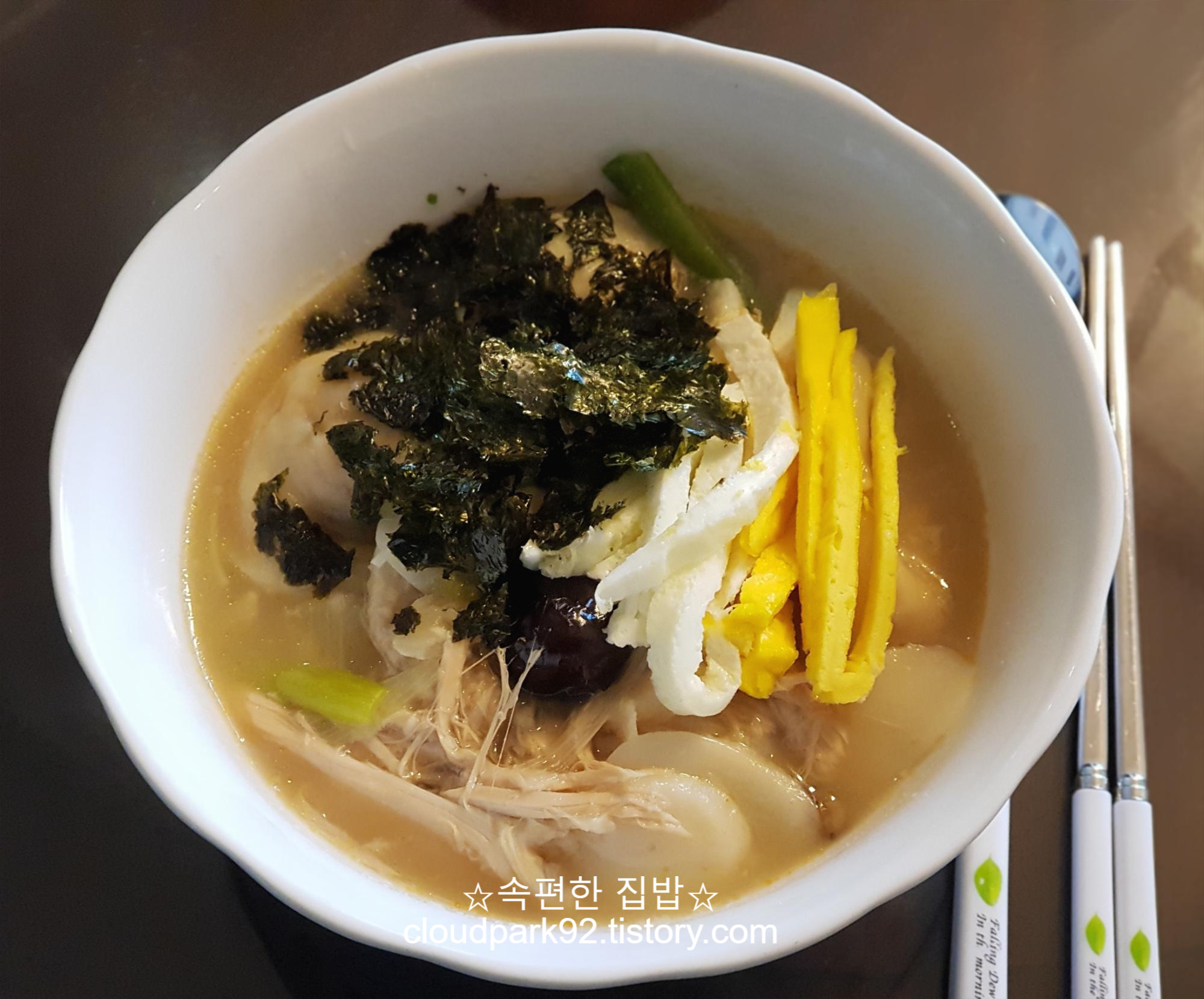 전날 끓여놓은 닭고기 국물로 2021년 첫 떡만둣국을 끓입니다