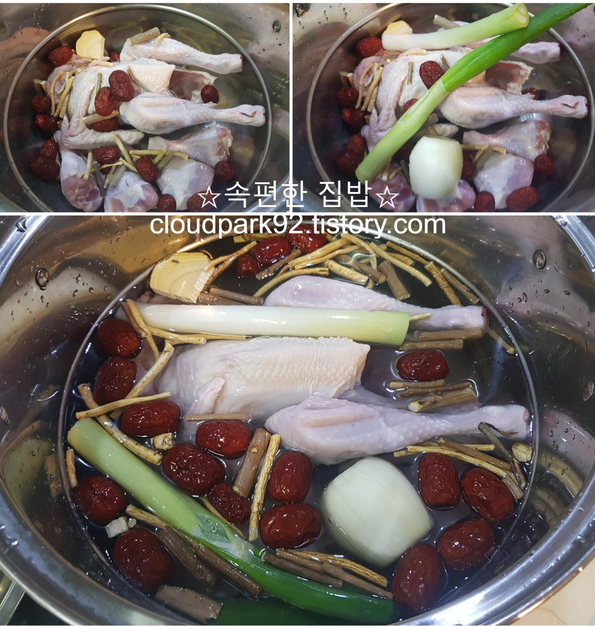 백숙 패키지안에 기본으로 들어있는 약재를 넣어 주었어요