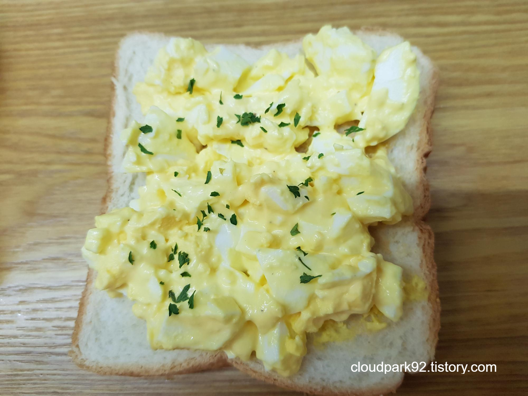 잘게 다진 계란에 마요네즈와 소금, 후추를 넣고 살살 섞어 주면 에그 샌드위치 속이 완성되었어요.