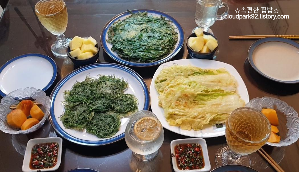 배추전과 세발나물전과 부추전으로 차린 주말 점심입니다~