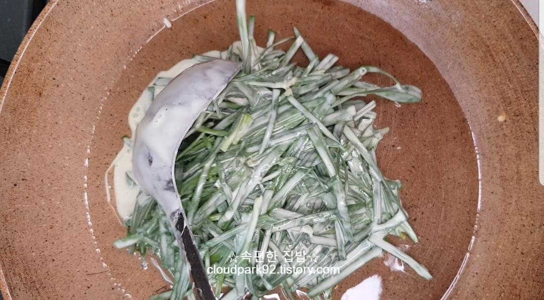 반죽 2 국자에 세발나물 1 대접을 담고 섞어주세요