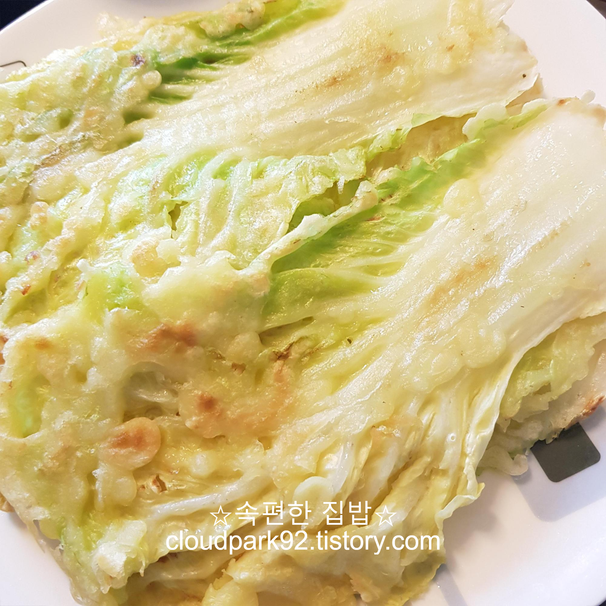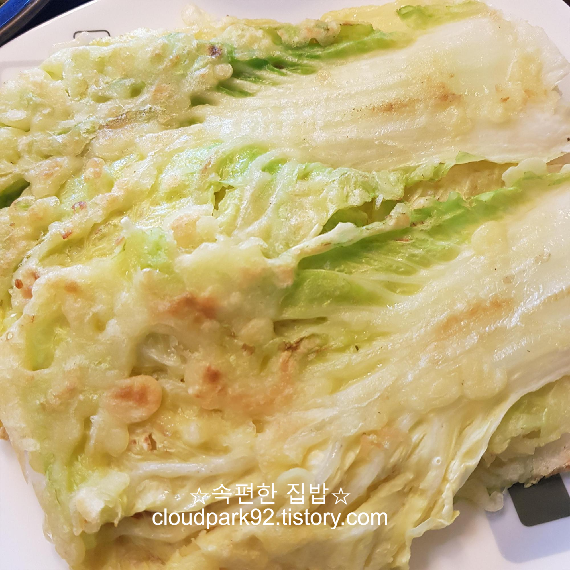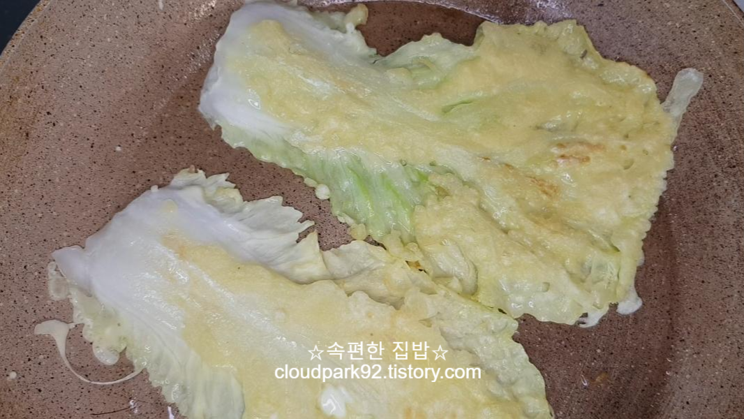 반죽을 배춧잎 앞뒤로 흠뻑, 골고루 묻혀주세요.