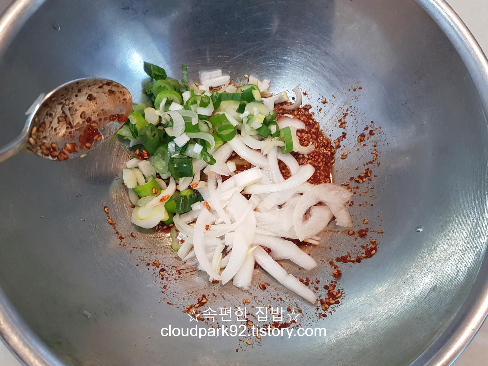 대파와 양파를 먼저 양념장과 버무려주세요.
