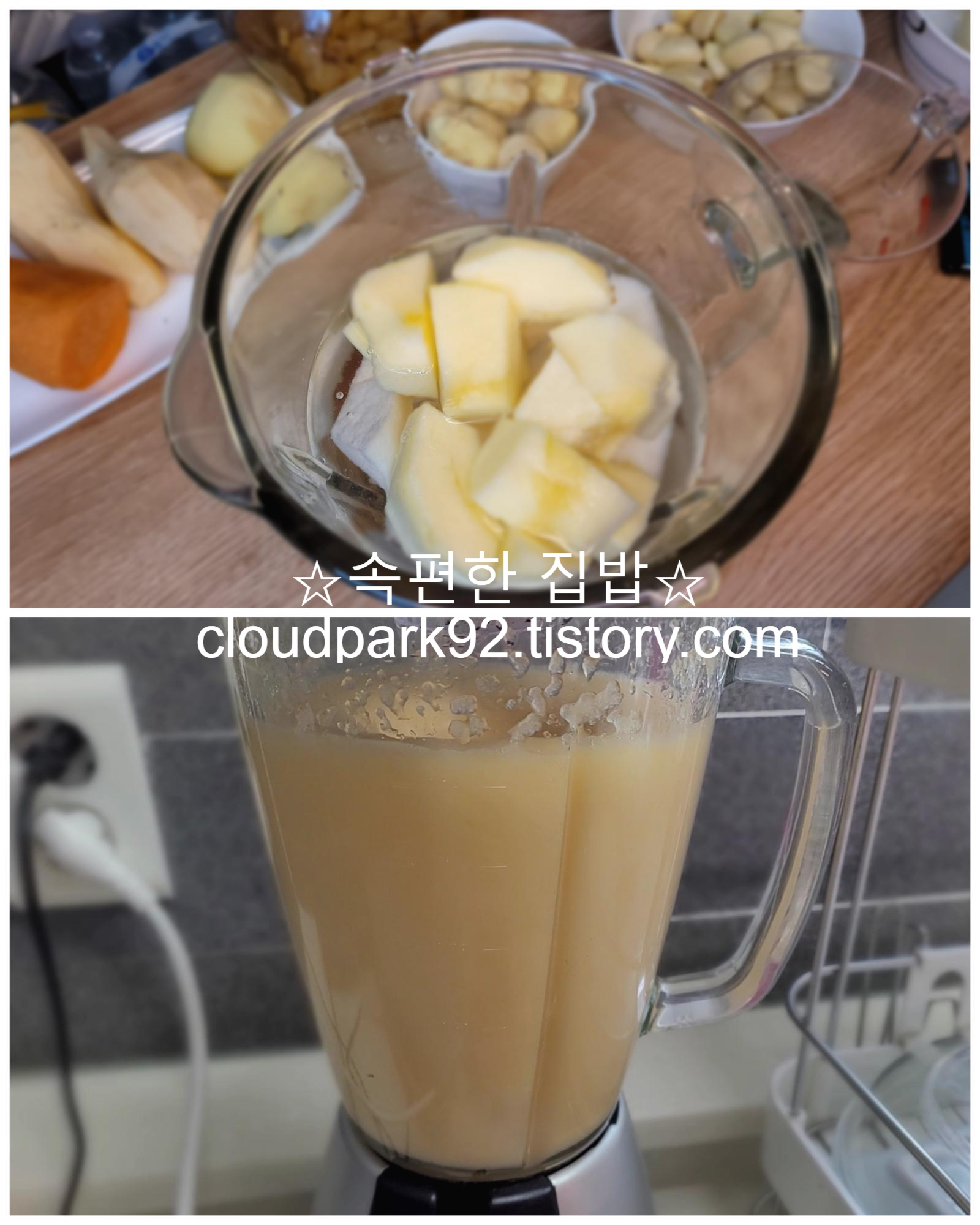 소갈비를 끓이는 동안 양념으로 사용할 과일을 갈아 주세요.