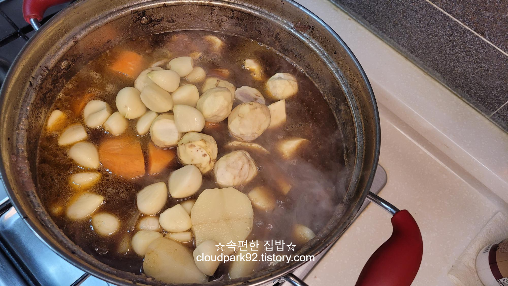 감자, 당근, 고구마, 밤, 마늘 같은 단단한 재료들을 먼저 넣되,