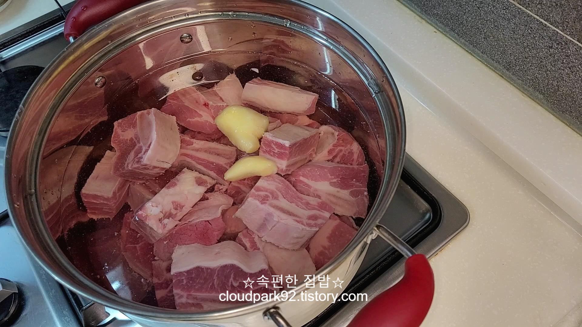 소갈비 냄비의 물이 한 번 우르르 끓어오르면 물을 모두 버려주세요.