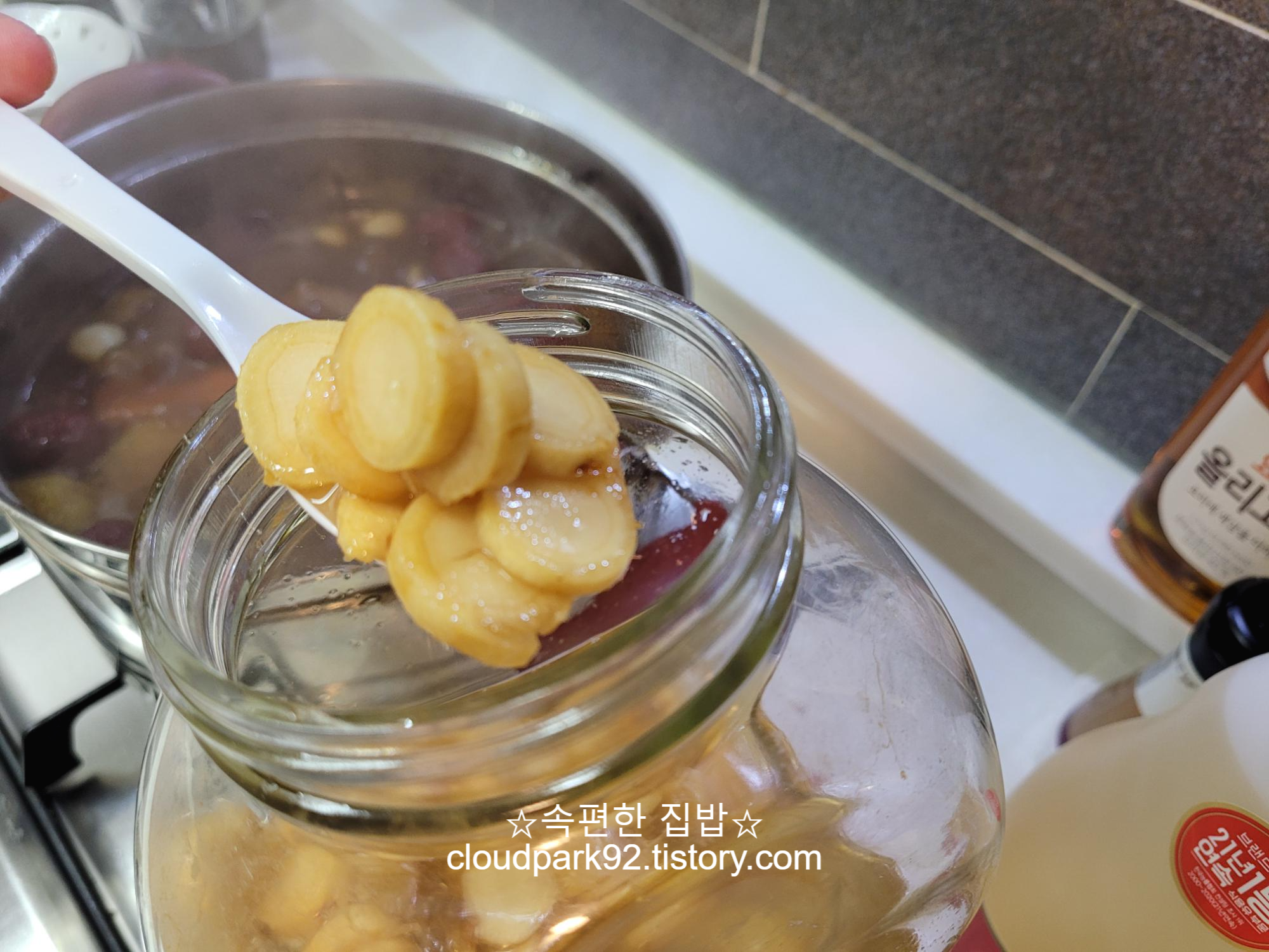 꿀 인삼 3 큰 스푼, (꿀 인삼 물 2 큰 스푼) 넣고 계속 졸여줍니다.