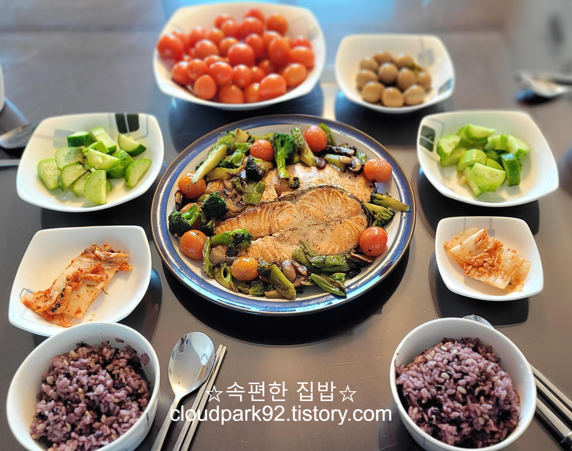 평소처럼 신선한 재료, 간단한 레시피, 최소한의 양념으로 차린 밥상이에요.