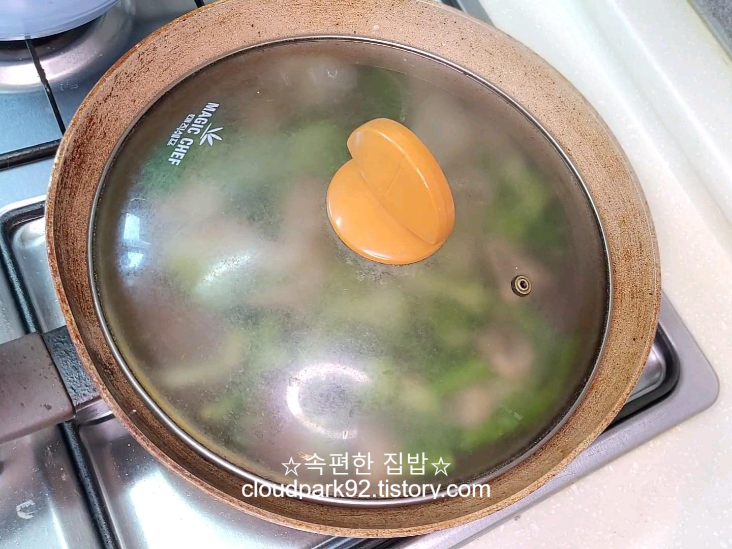 뚜껑을 덮고 익혀주면 빨리 익고 수분이 나와 촉촉하게 익어요