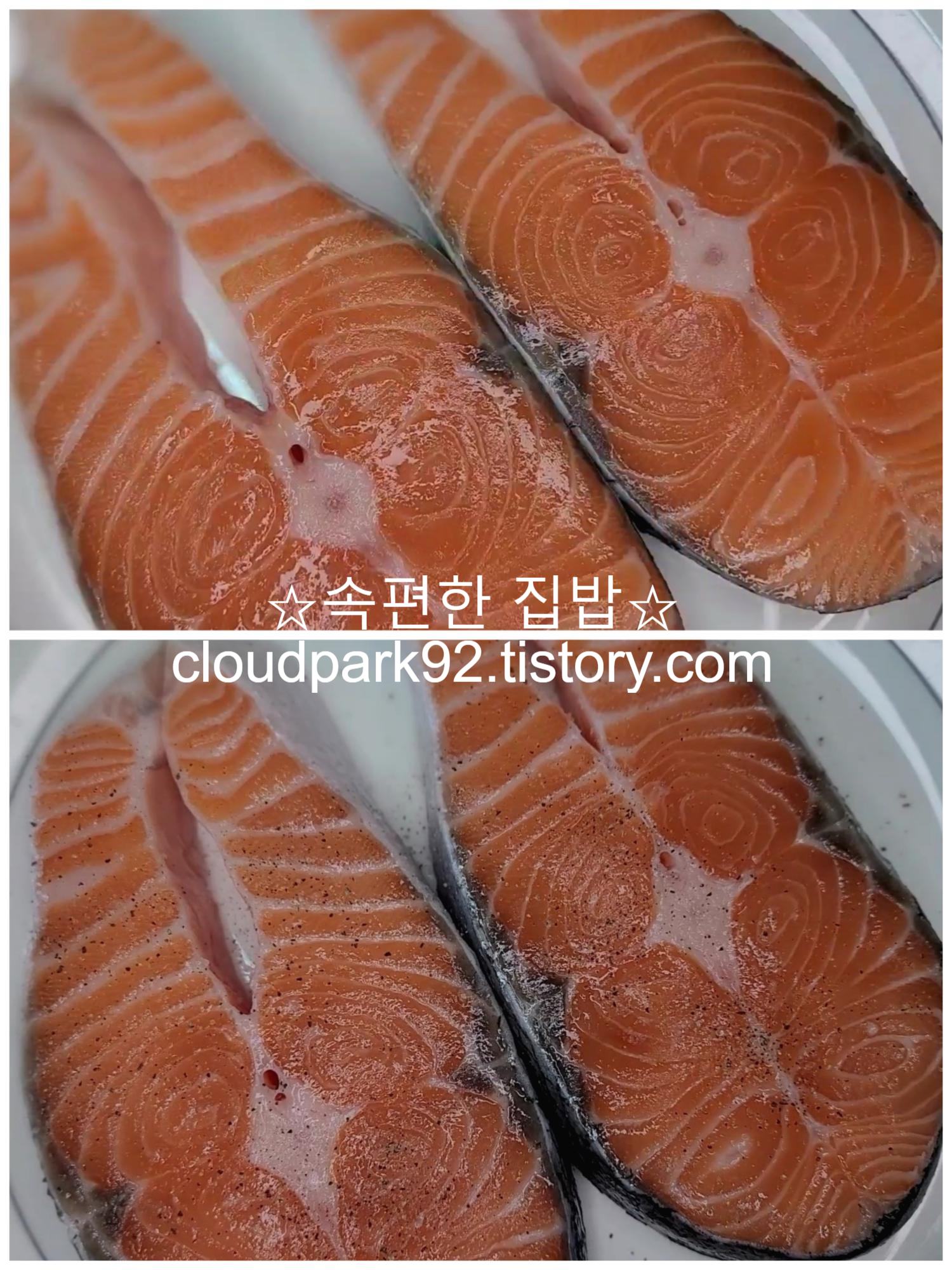 싱싱한 연어에 소금과 후추로 살짝 밑간을 해주세요