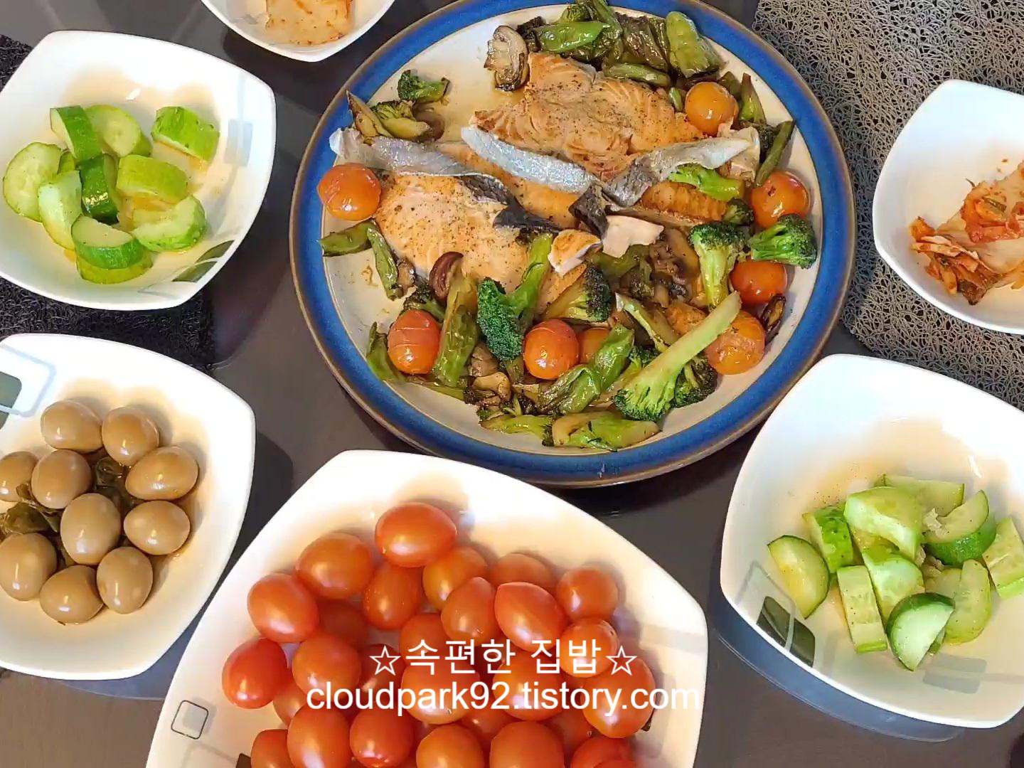 오늘은 연어구이(연어스테이크)와 메추리알 조림과 오이 샐러드로 밥을 차렸어요.