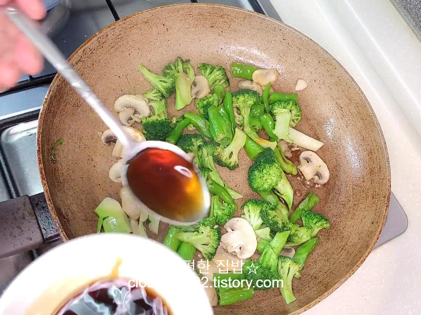 브로콜리와 양송이 버섯과 남은 꽈리고추를 넣고 볶아주세요.