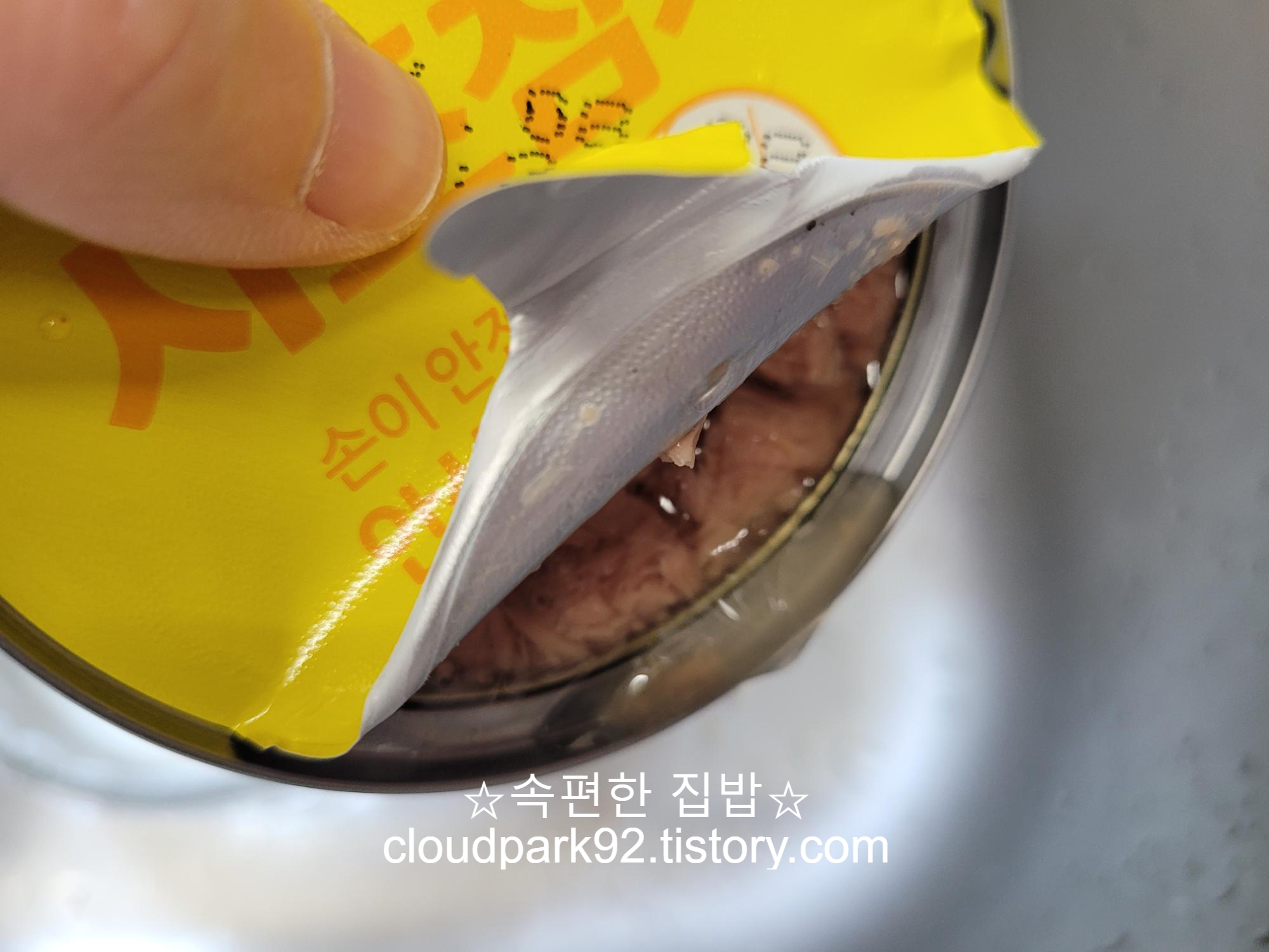 캔 참치 한 개 뜯어서 참치 국물은 졸졸졸 따라 버리고