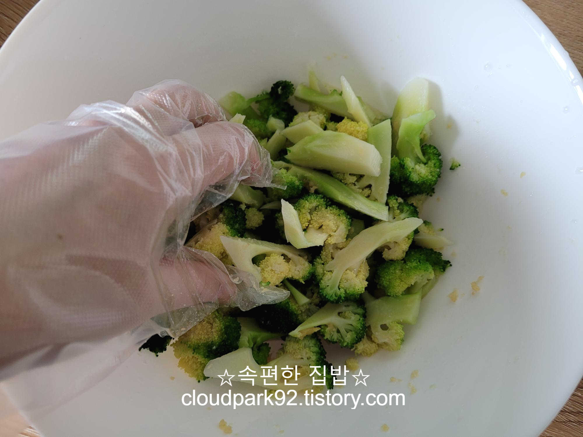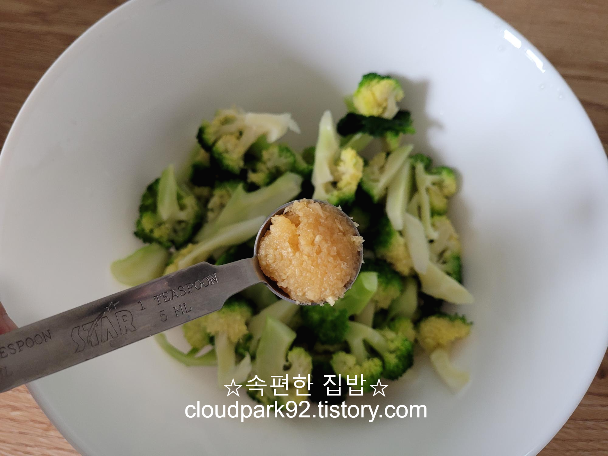 참기름과 다진 마늘을 넣고 무친 브로콜리 무침이에요.