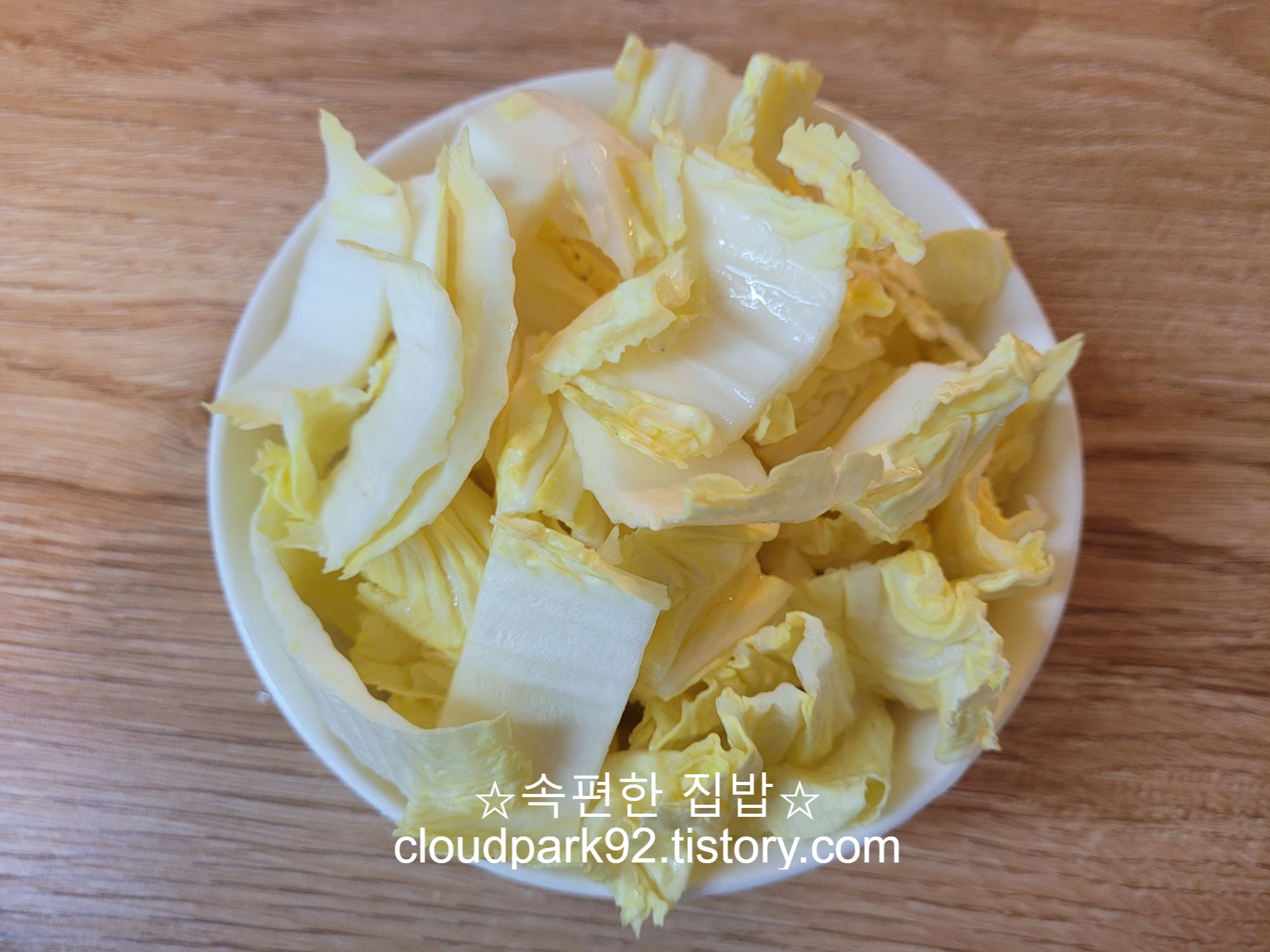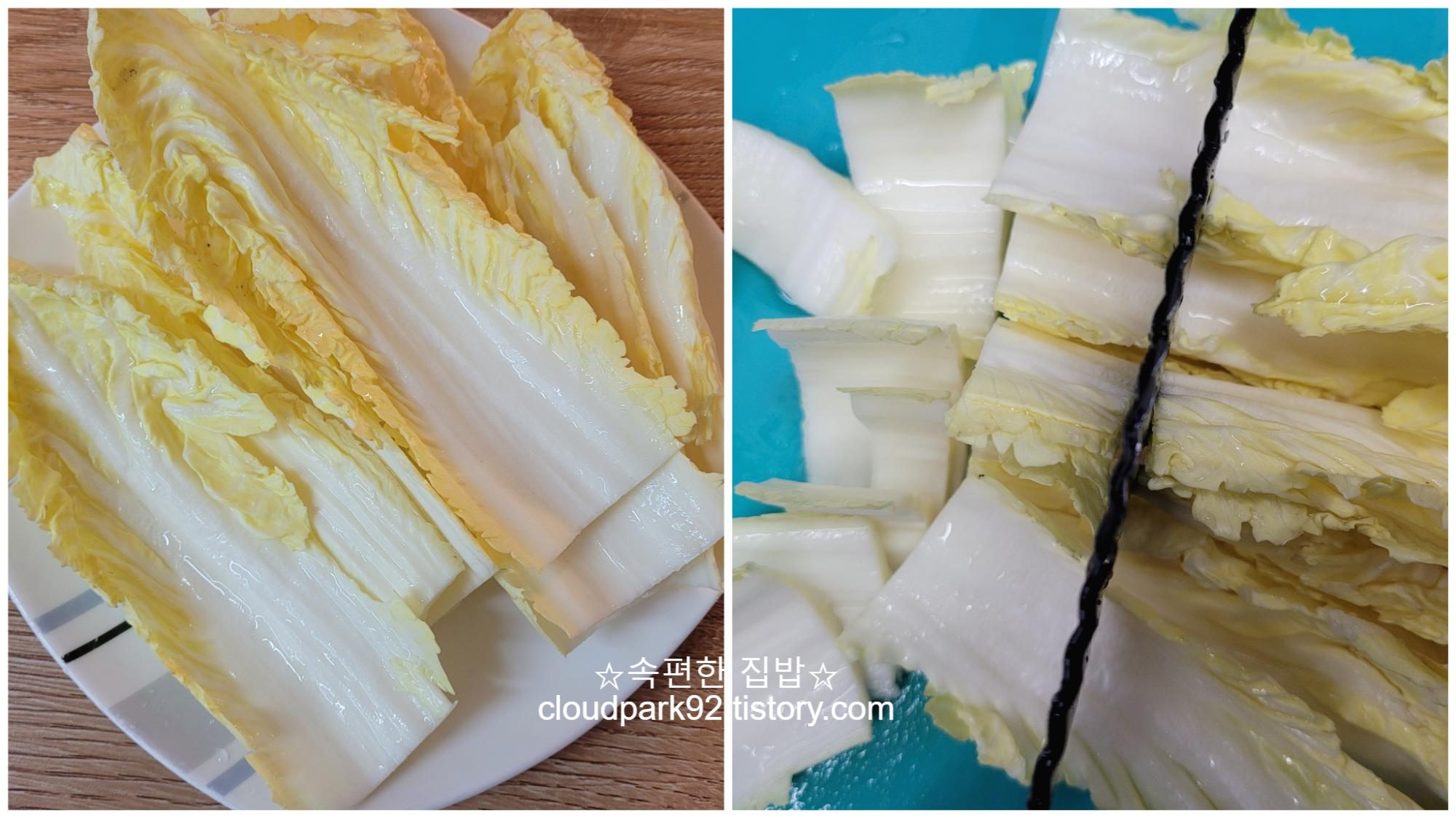 먼저 알배기 배추는 2센티미터 너비로 잘라주세요.