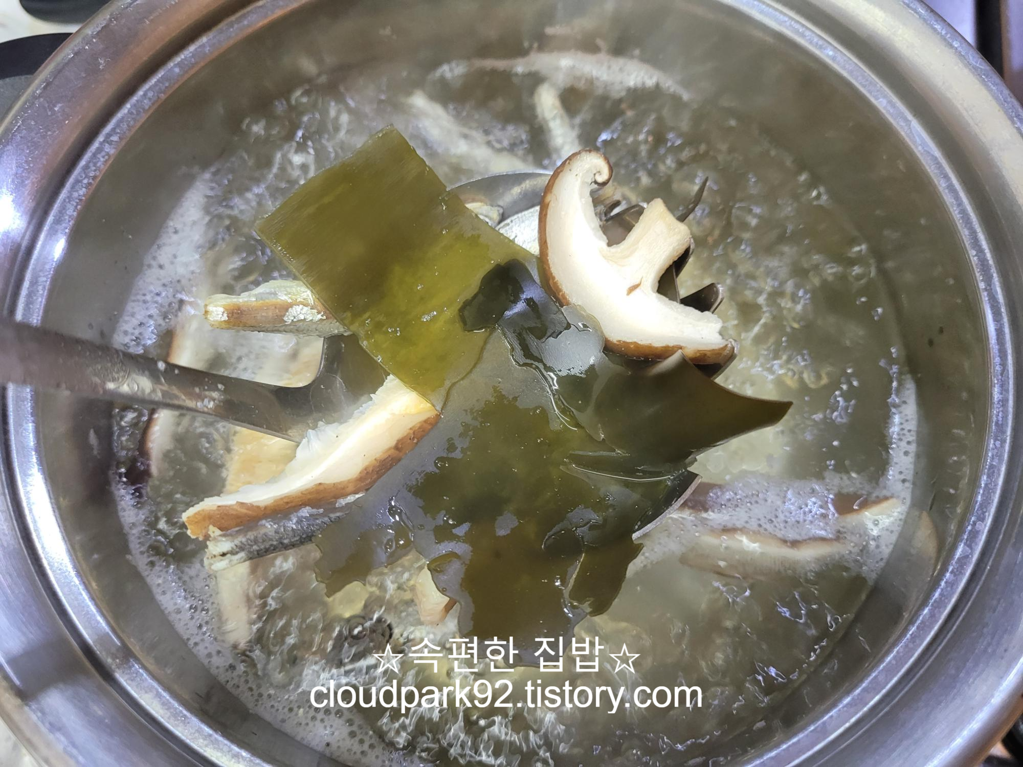 국물용 멸치(4-5 마리), 표고버섯, 다시마를 넣고 끓여 육수를 내주세요.