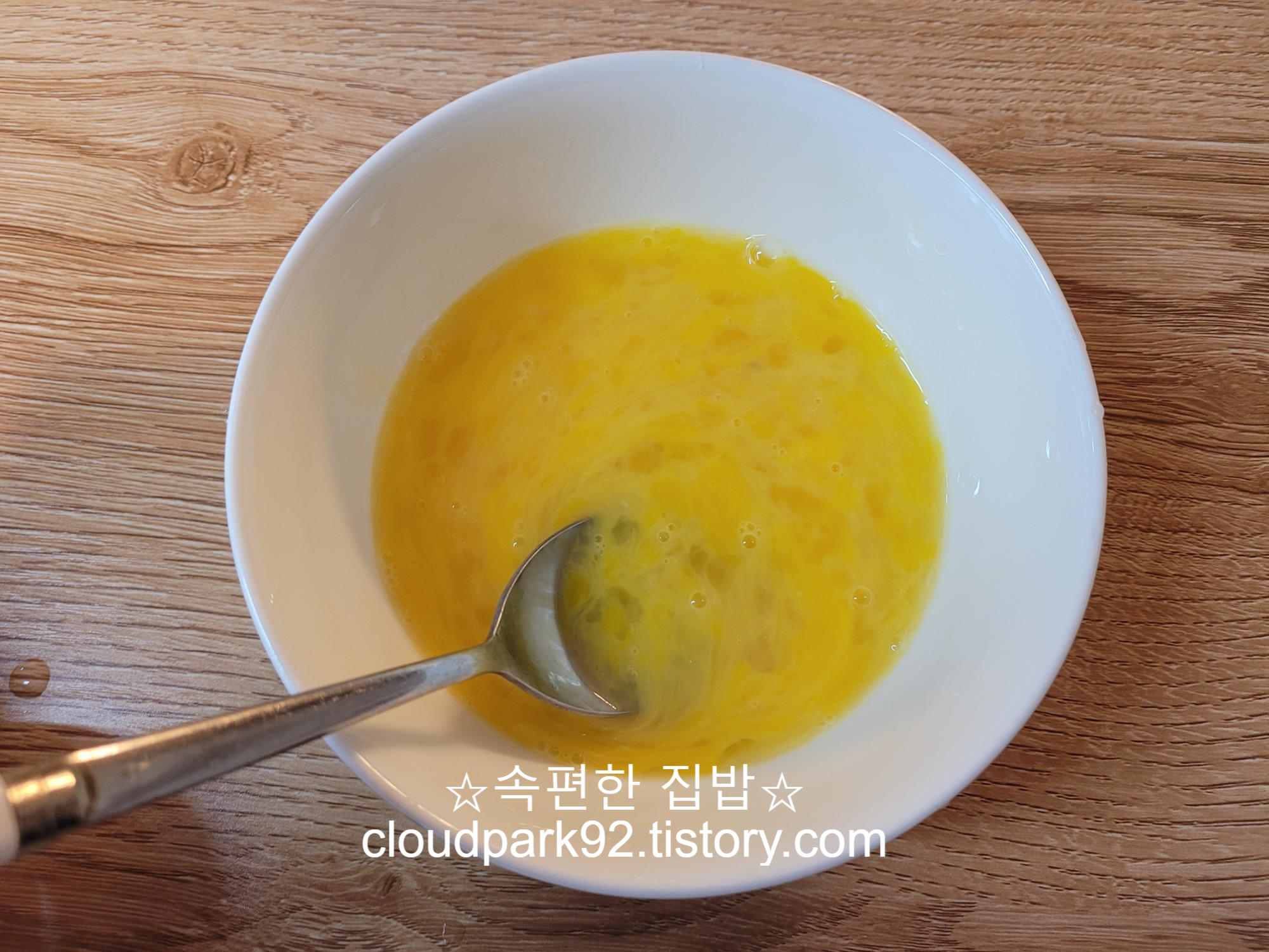계란을 달팽이집을 그리듯 원을 그려주며 부어주세요.