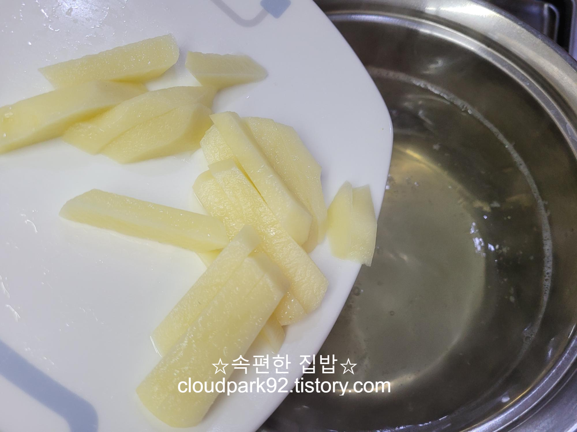 감자 1개를 0.5-0.7 두께로 채 썰어 주세요.