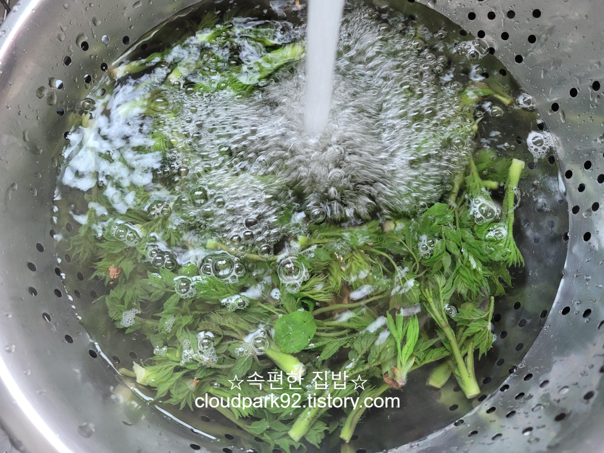 데친 두릅을 찬물에 헹구고 물기를 꼭 짜주세요.