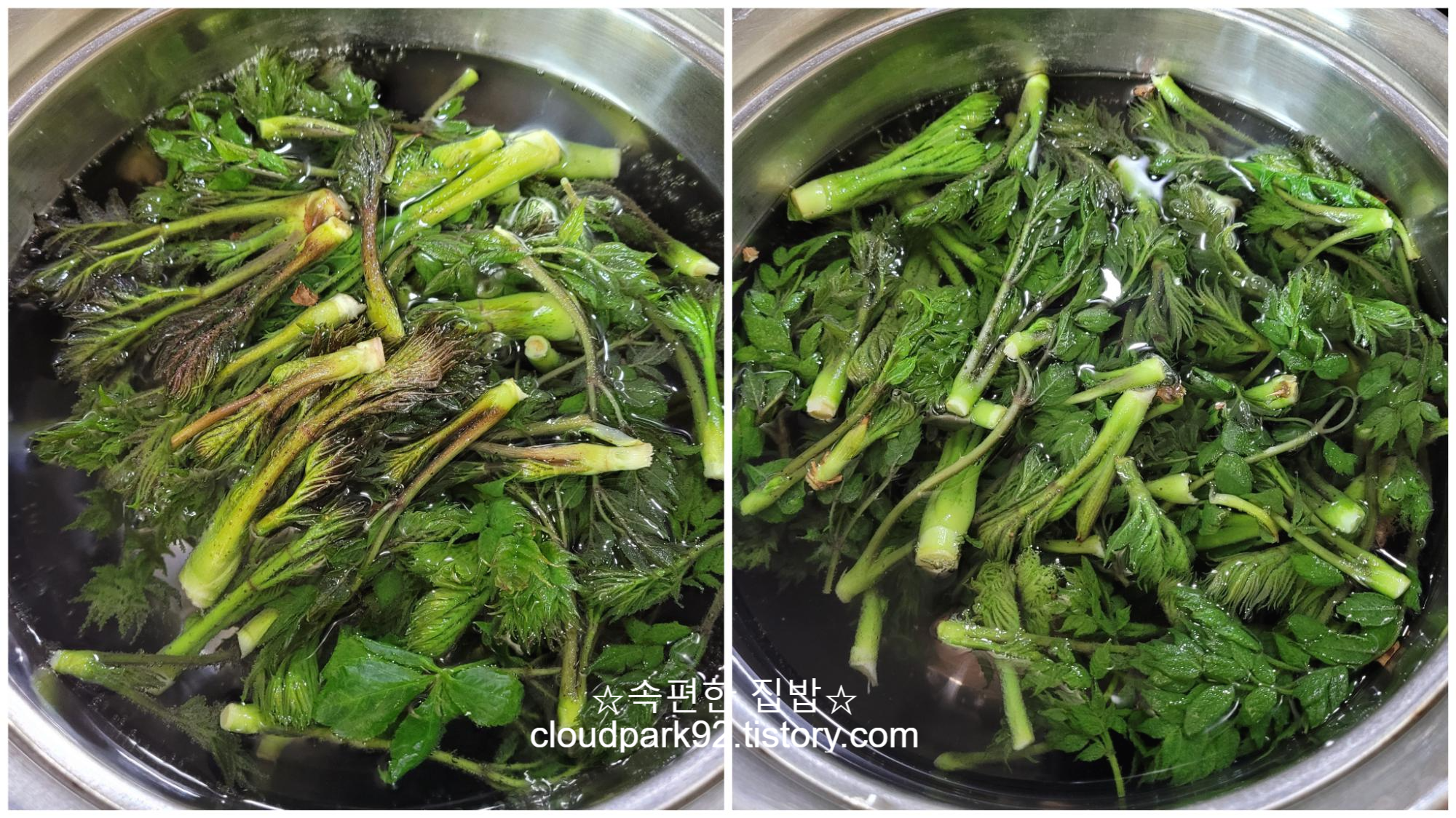 끓는 물에 두릅을 넣고 40초 정도 데쳐 주세요.
