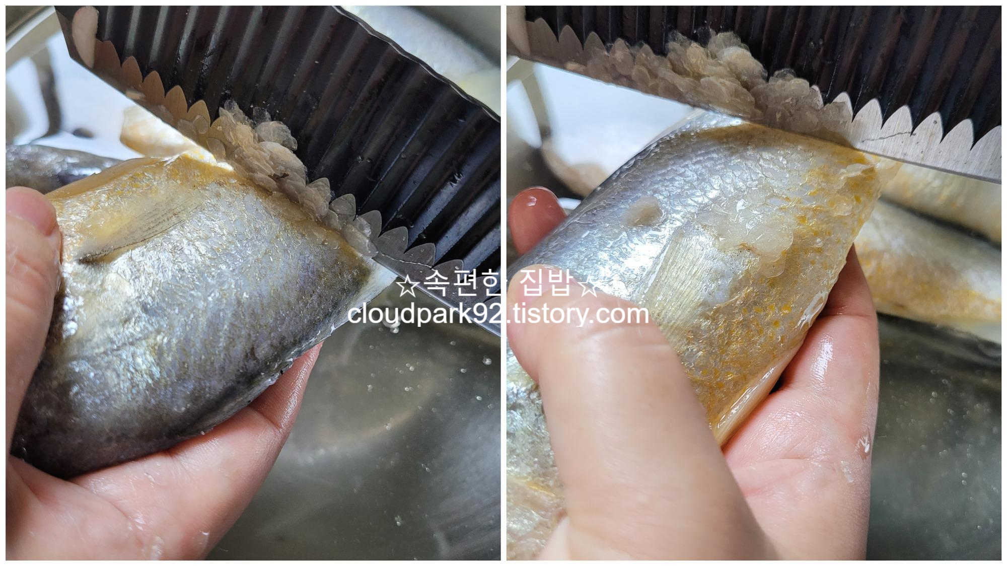 칼날로 조기 겉면을 살살 문질러서 비늘을 벗겨 줍니다.