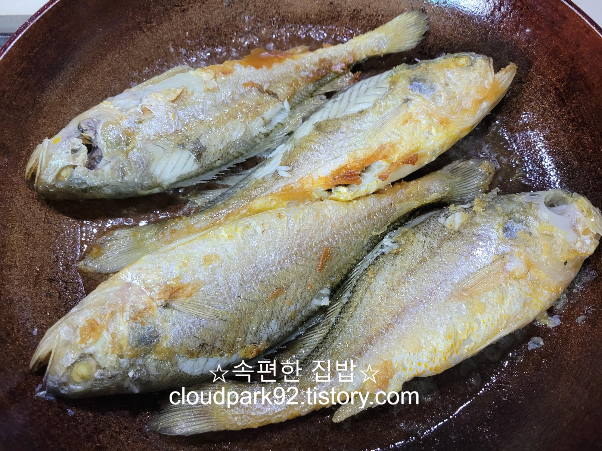 팬에 코팅이 덜 돼서 조기가 살짝 부서졌지만 이 정도면 괜찮은 비주얼입니다.