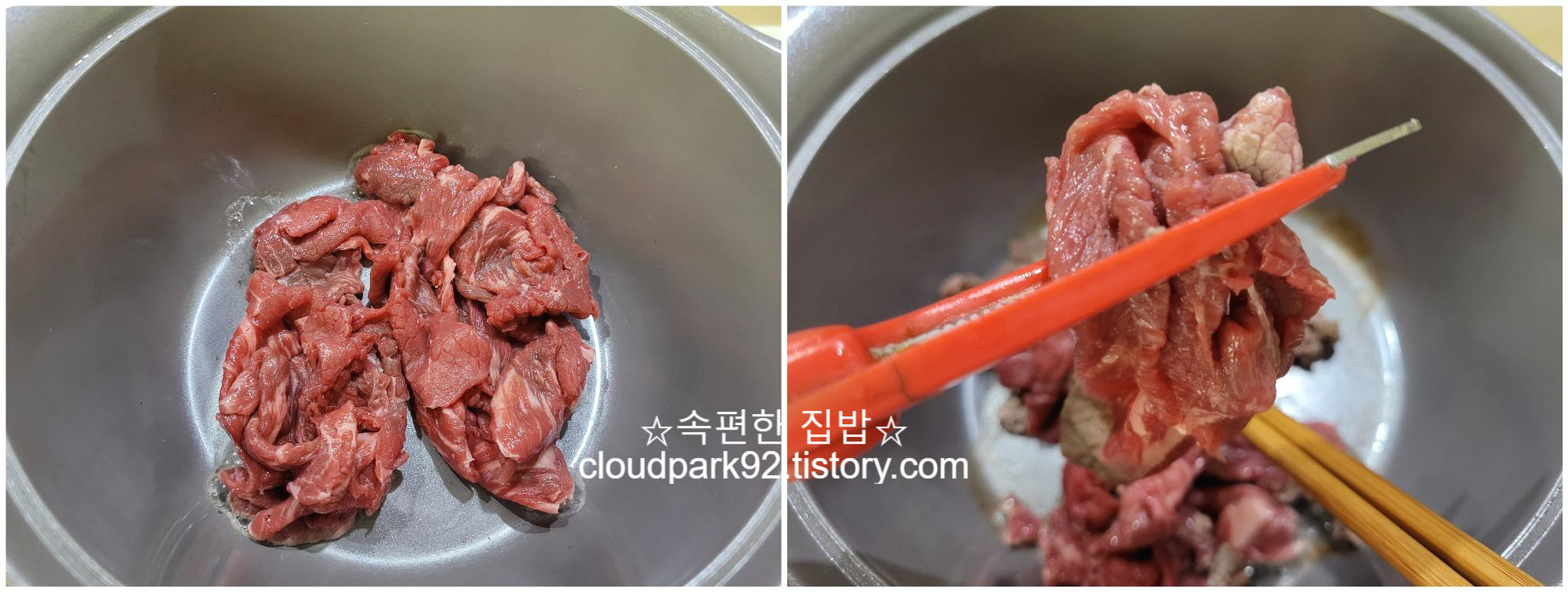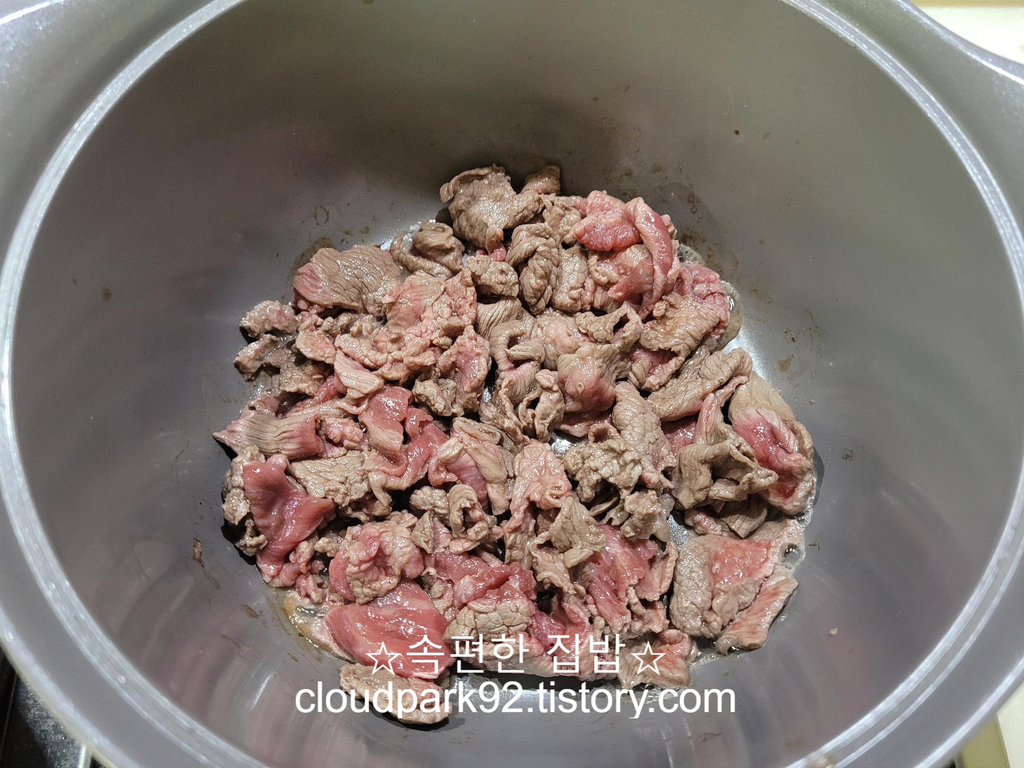 고기를 약한 불에 먼저 살살 볶아 주어요.