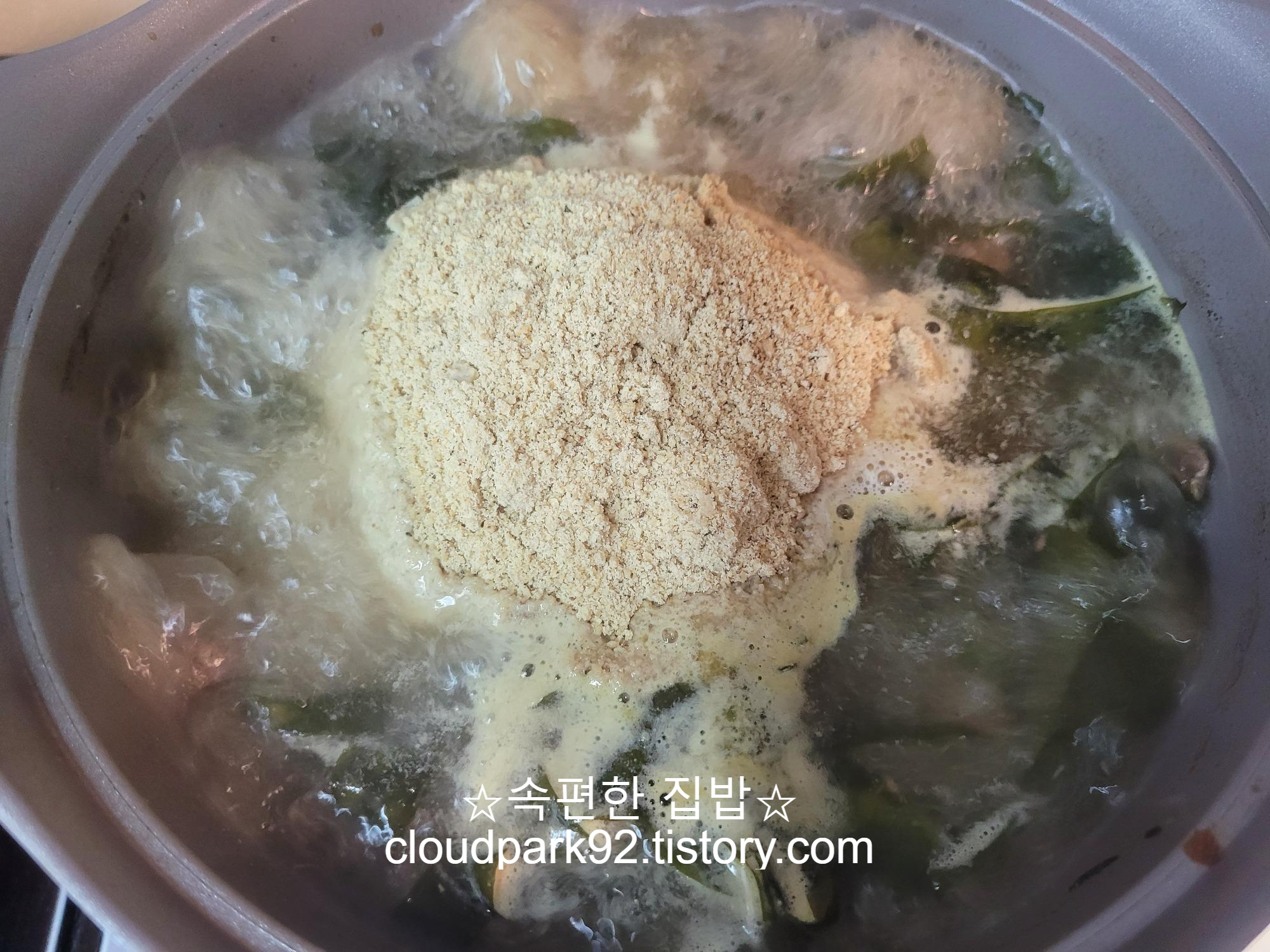 들깨가루는 잘 풀어지기는 하는데 그래도 뭉치지 않도록 잘 저어주고 5분 이상 푹 끓여줍니다.