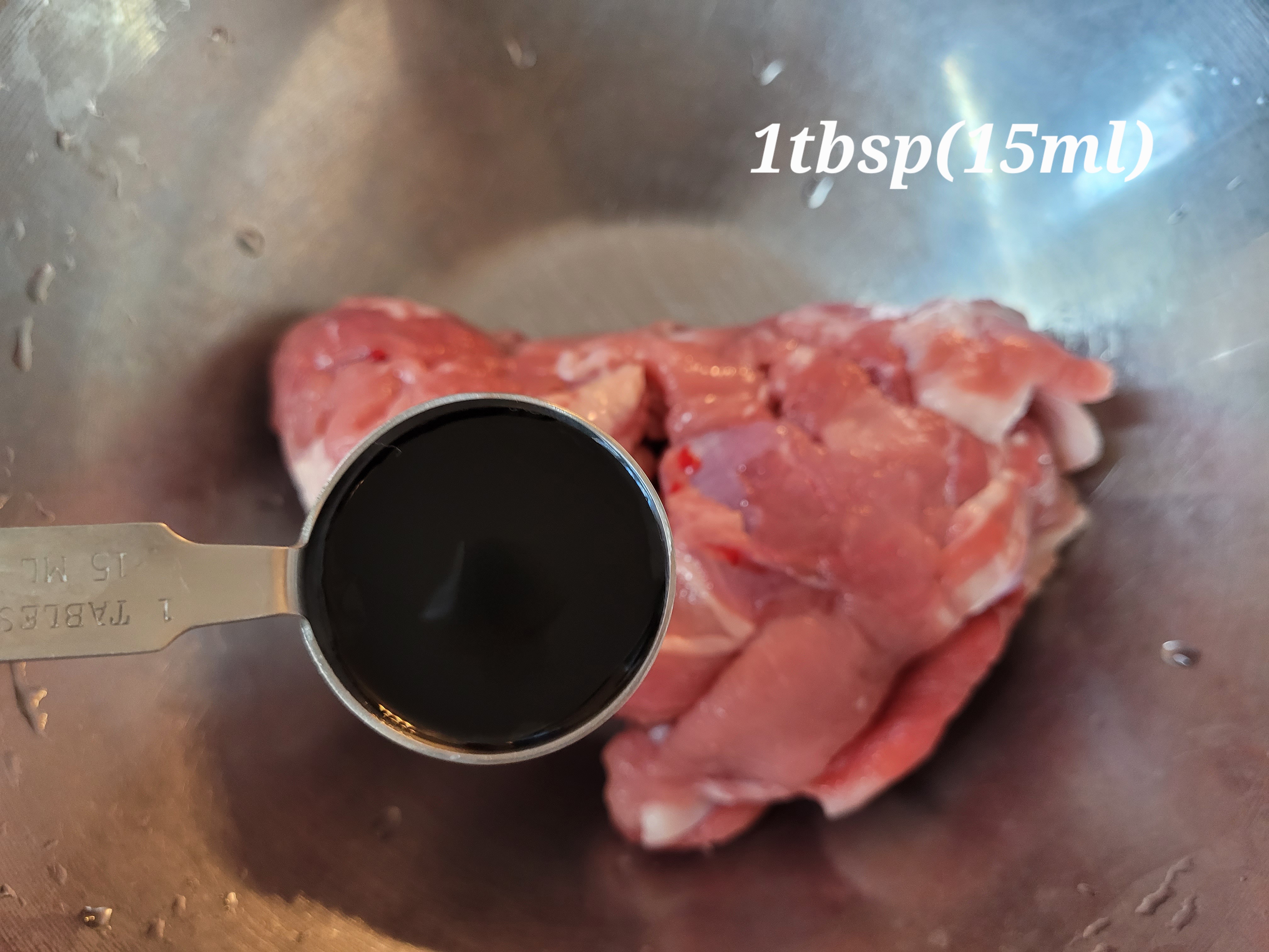 돼지고기 앞다리 530그램에 간장 1 tbsp 넣어 줍니다.