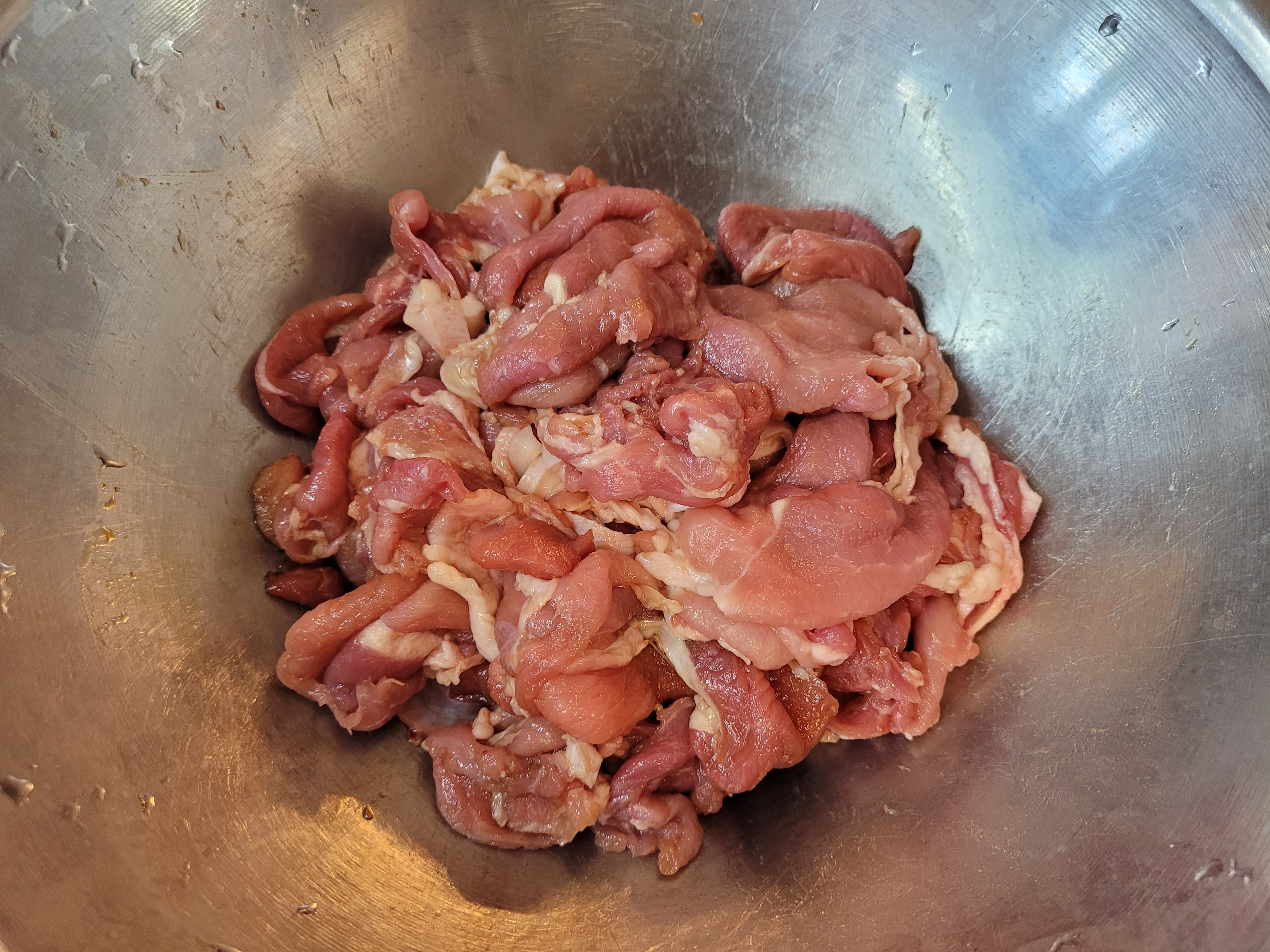 돼지고기와 간장을 조물조물 잘 섞어줍니다.