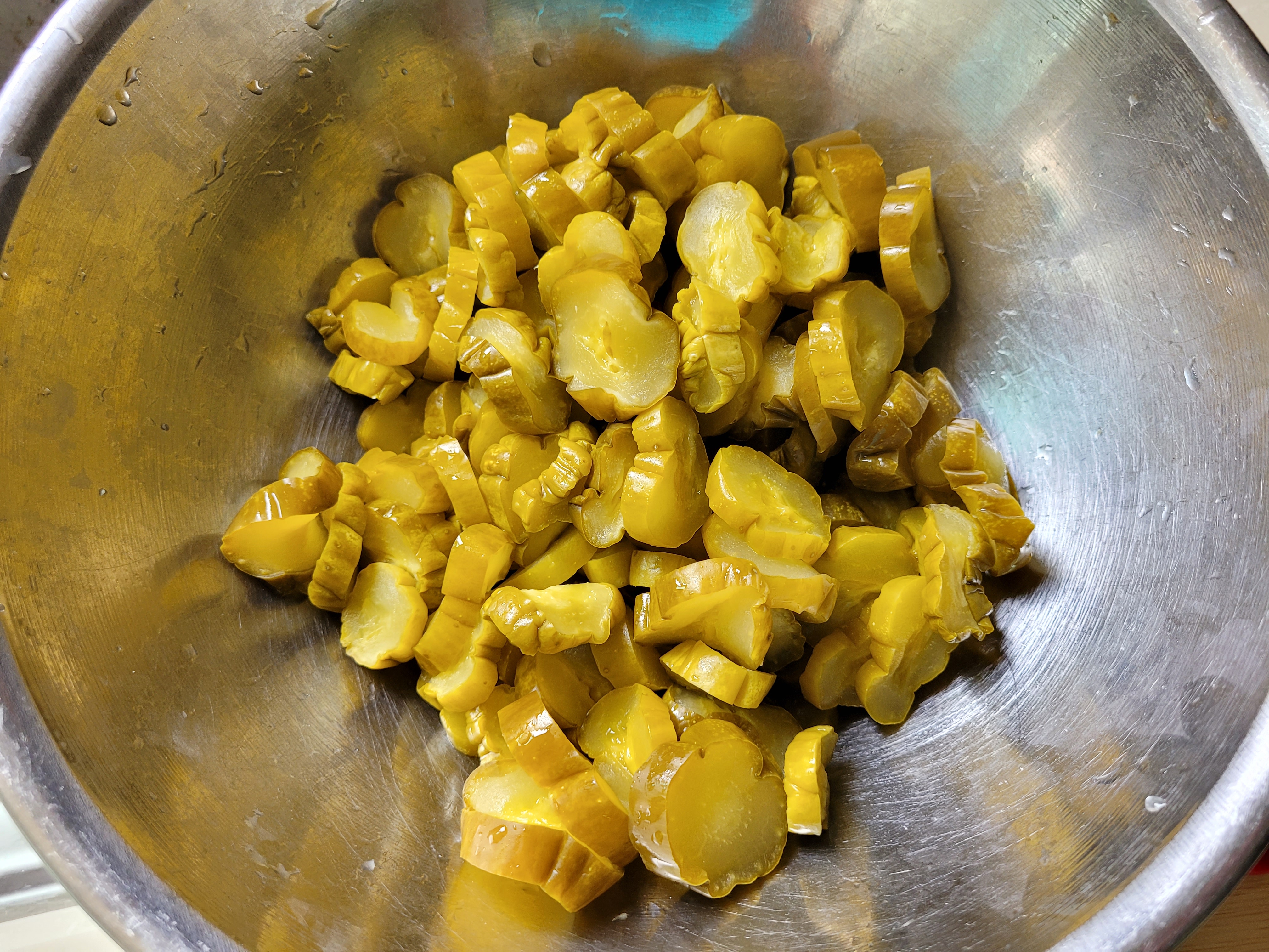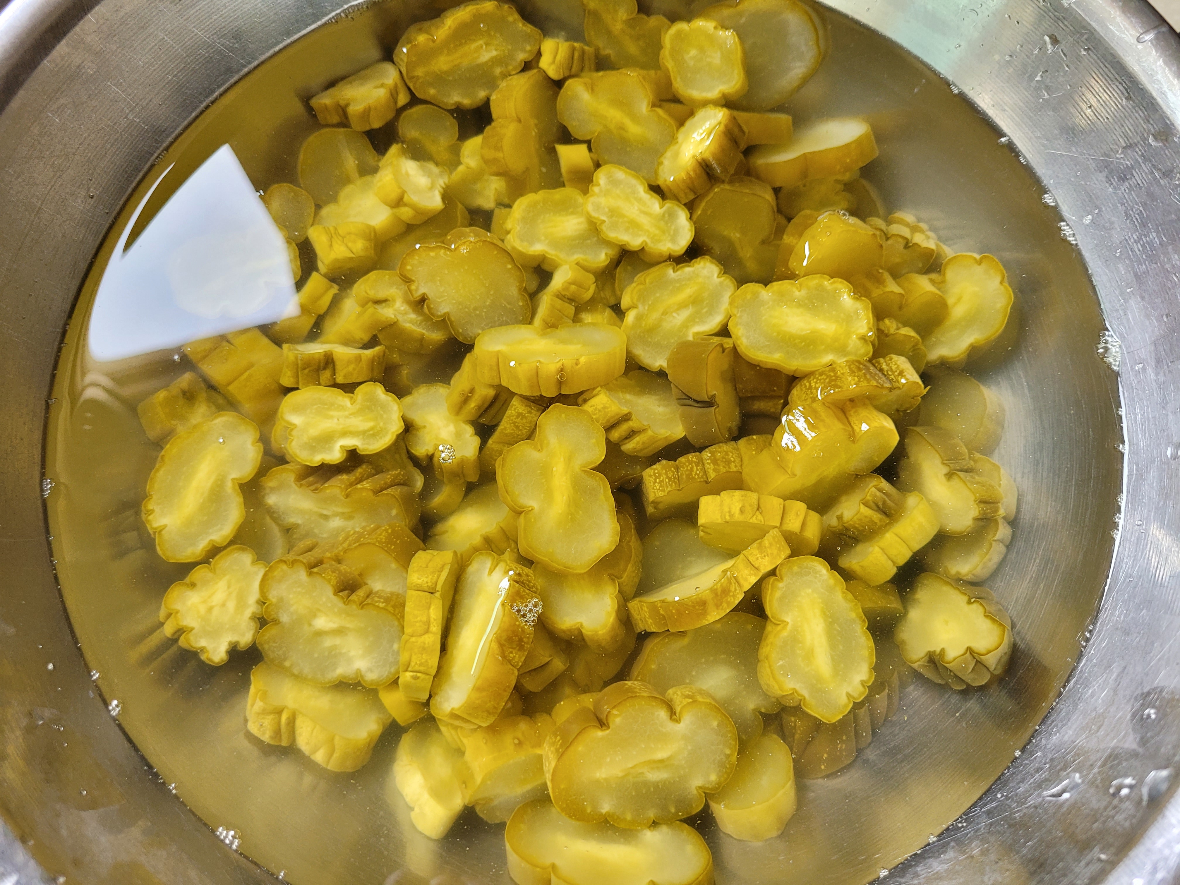 찬물에 담가 짠기를 뺀 오이지의 물기를 꼭 짜줍니다.