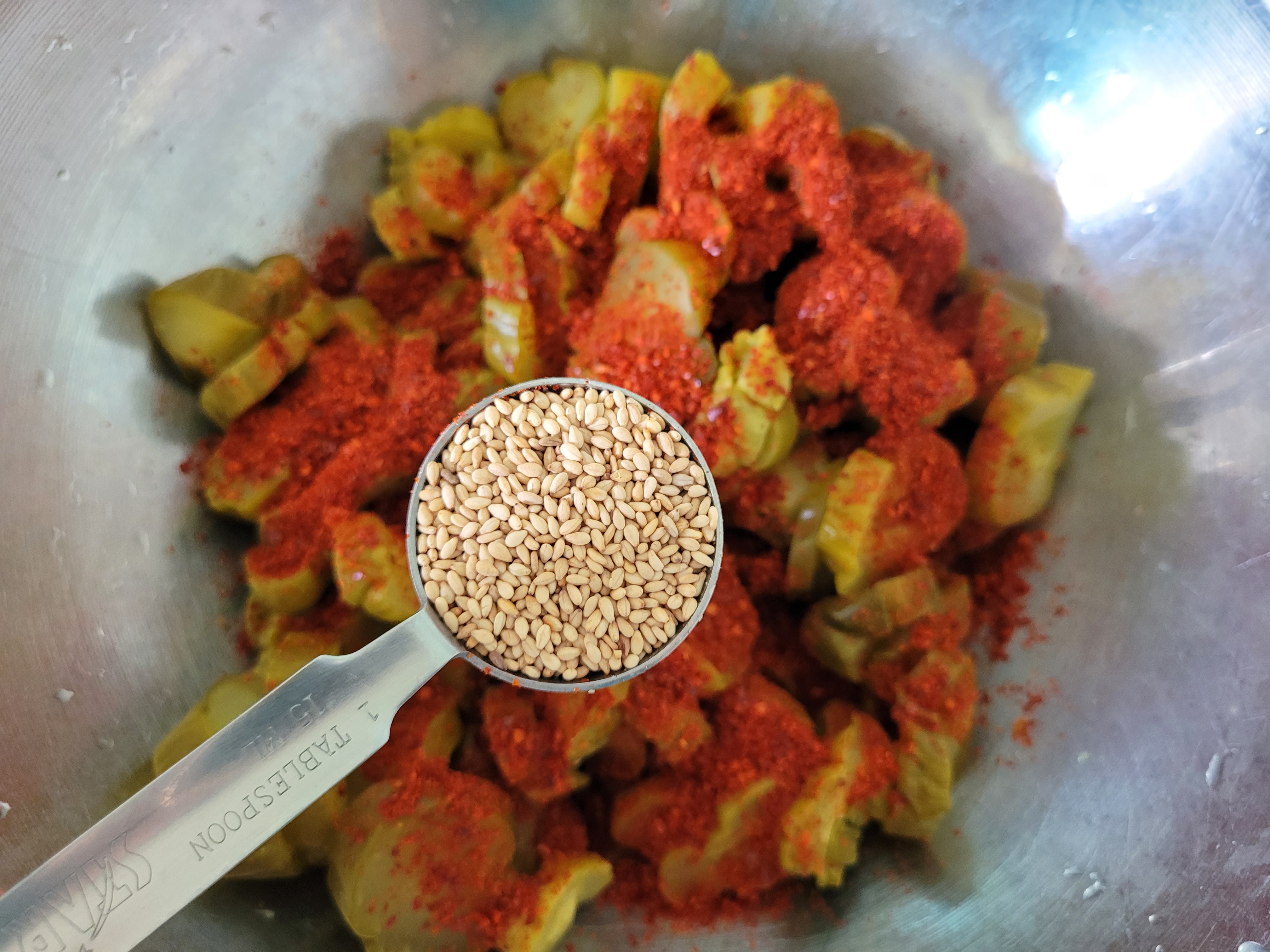 깨 1 tbsp 넣고 조물조물 무쳐줍니다.