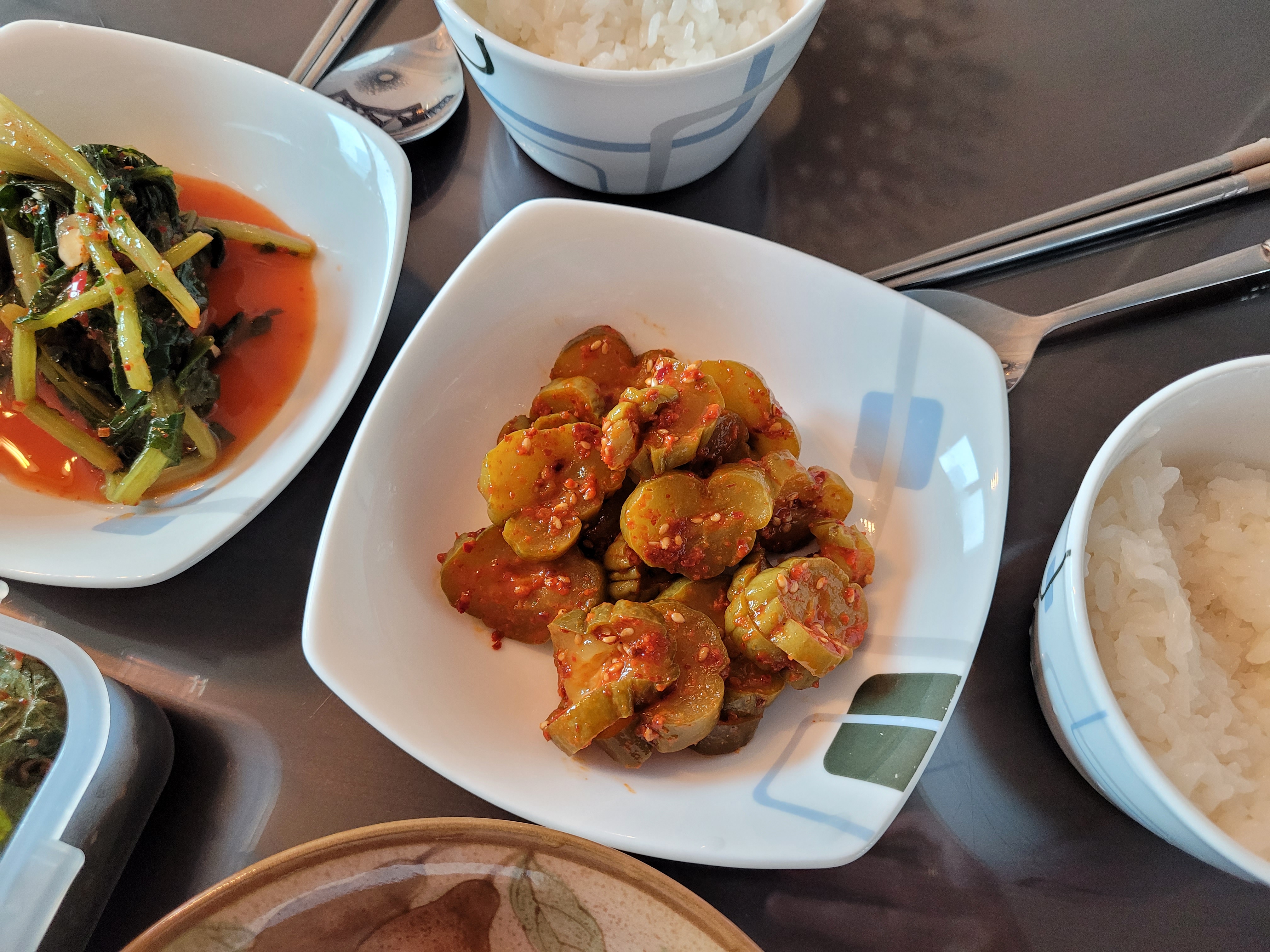 깻잎 장아찌, 고추장아찌, 열무김치 그리고 오이지무침