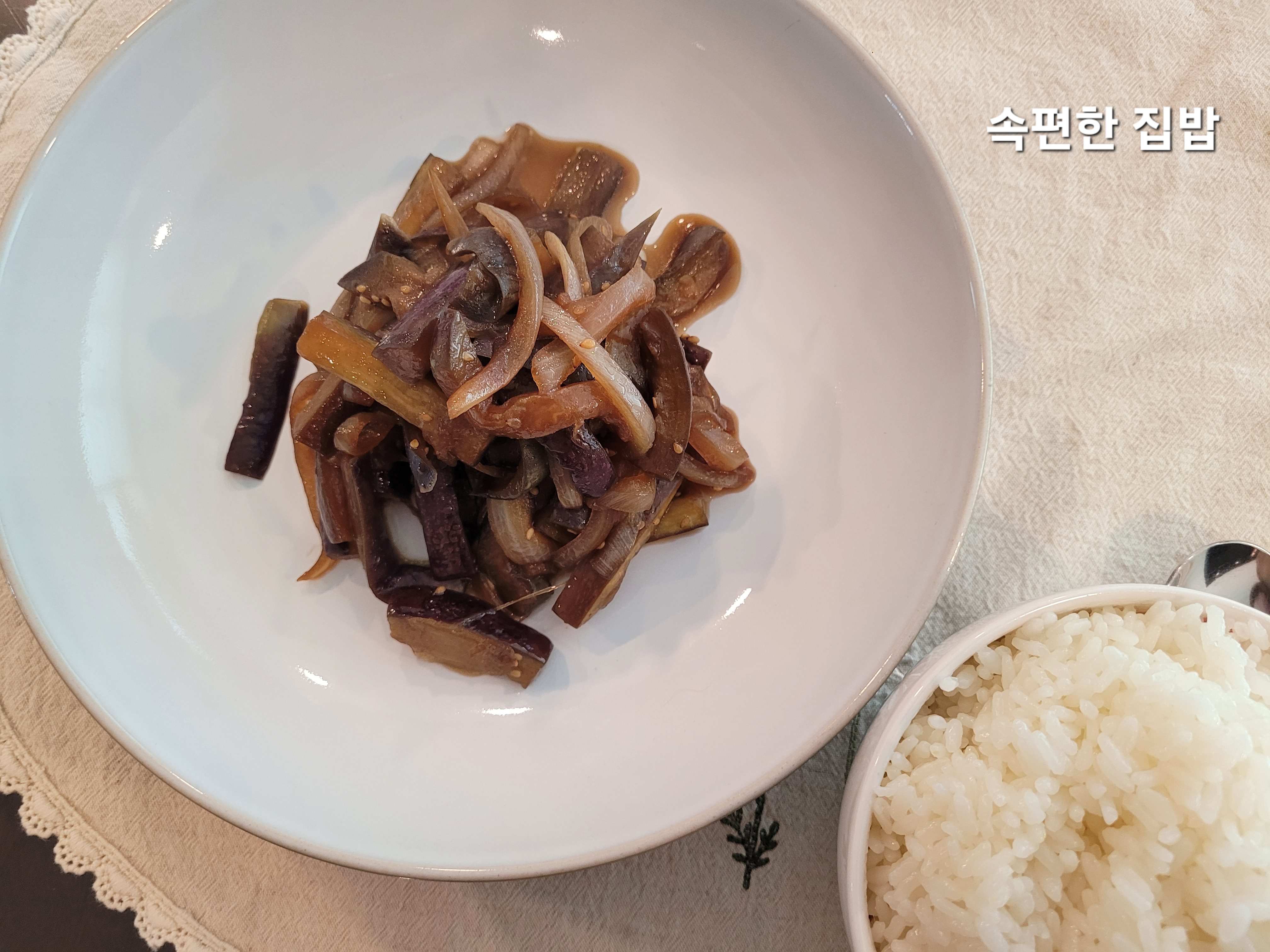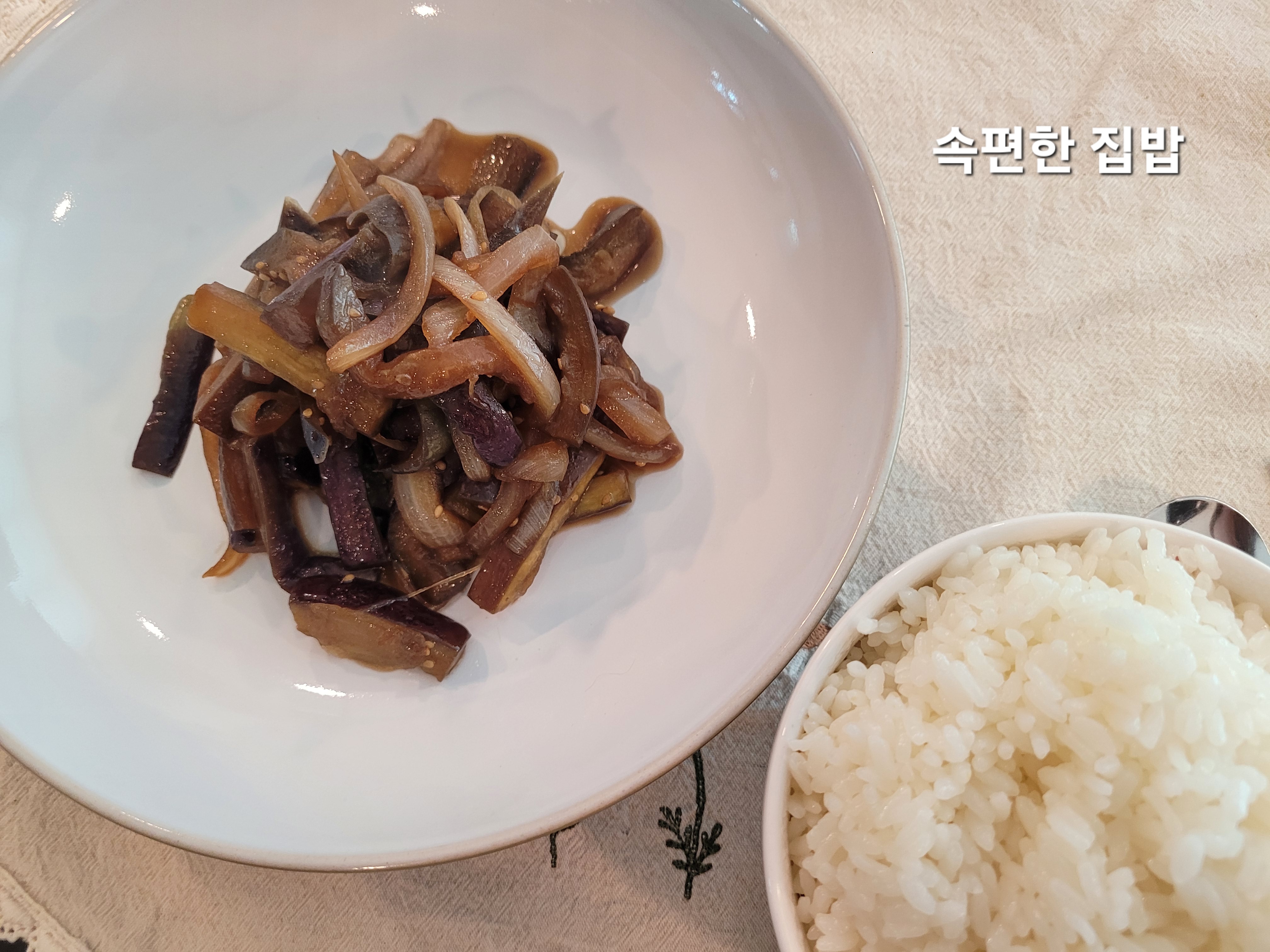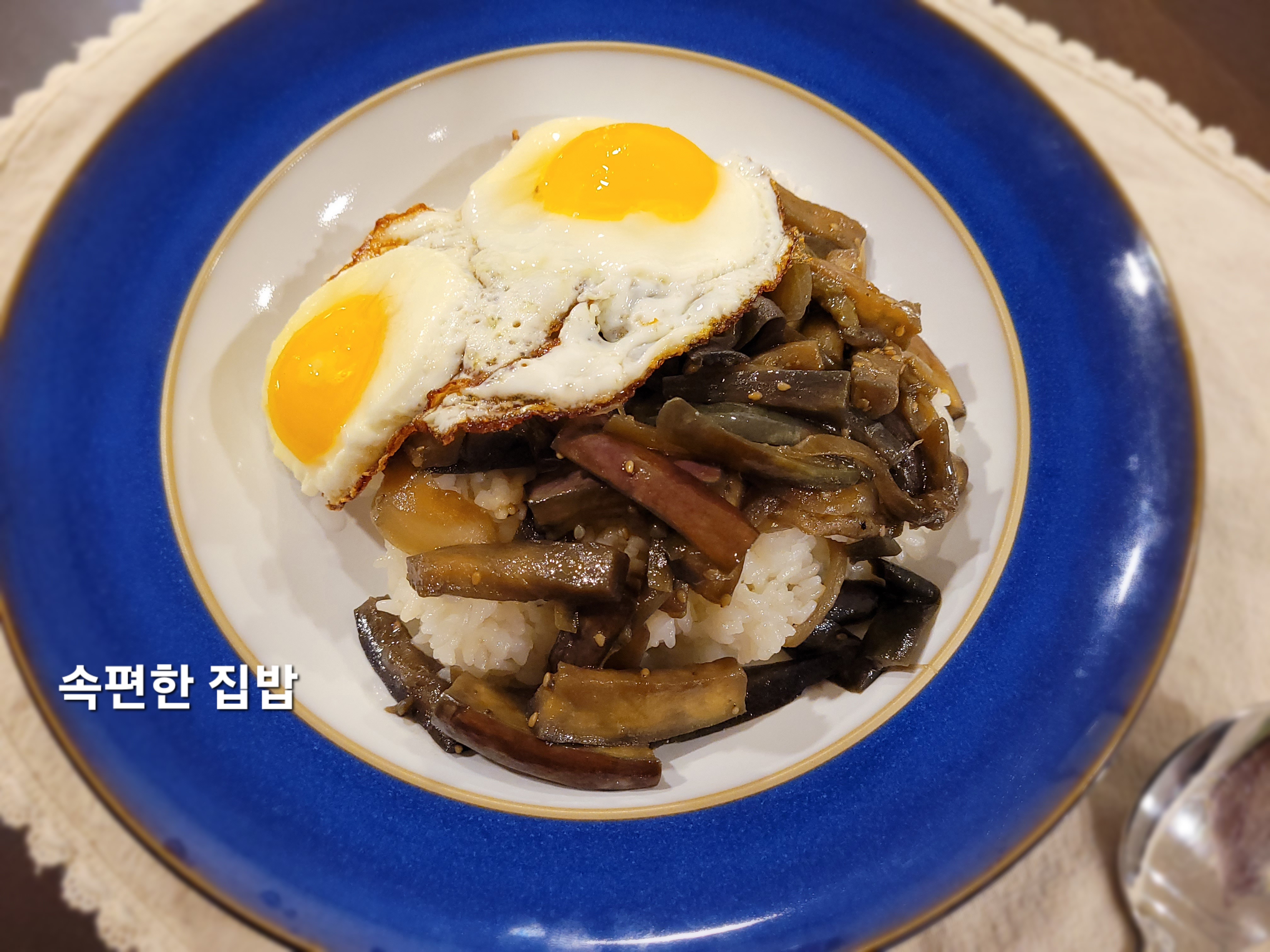 밥 위에 가지볶음 올리고 계란프라이 올려서