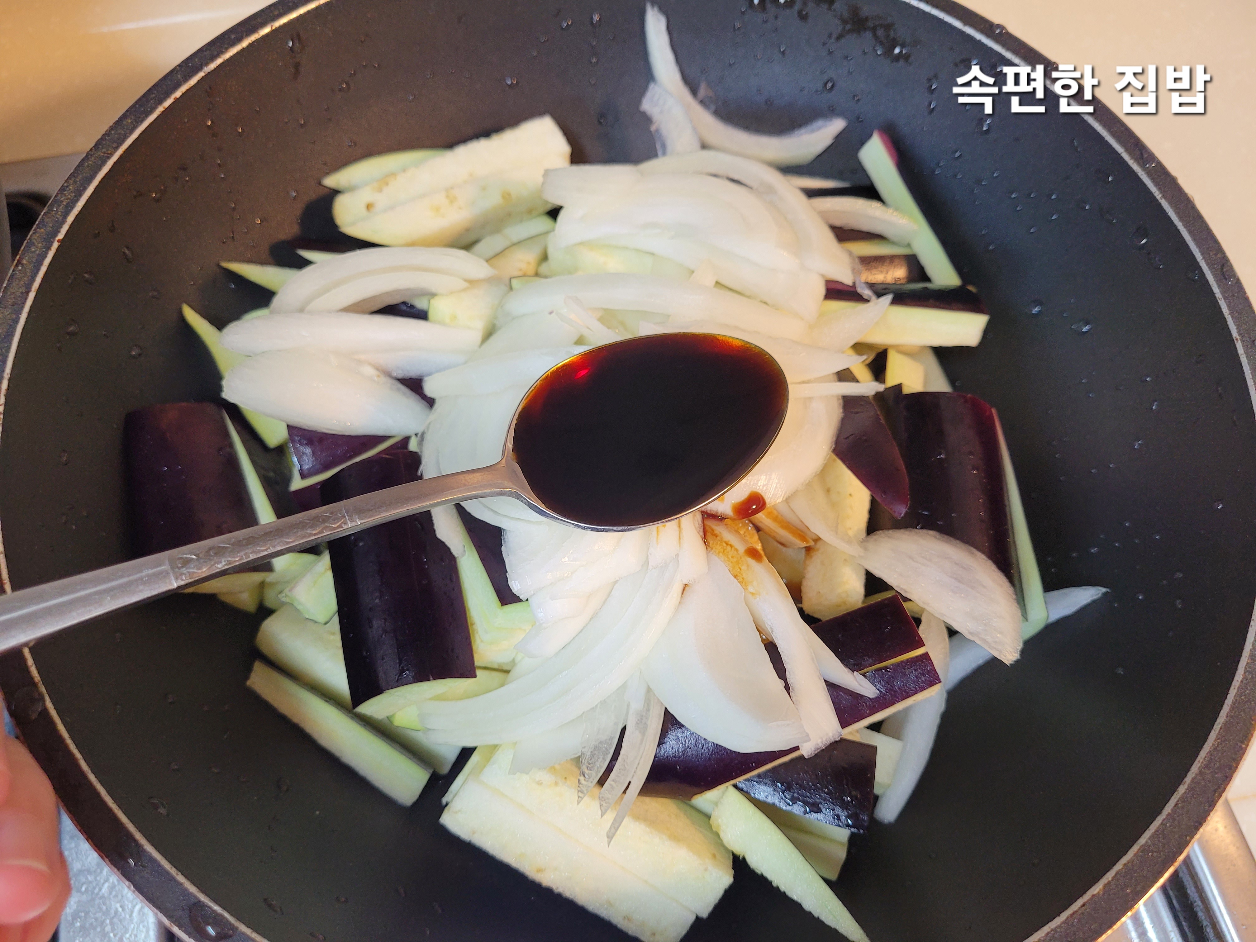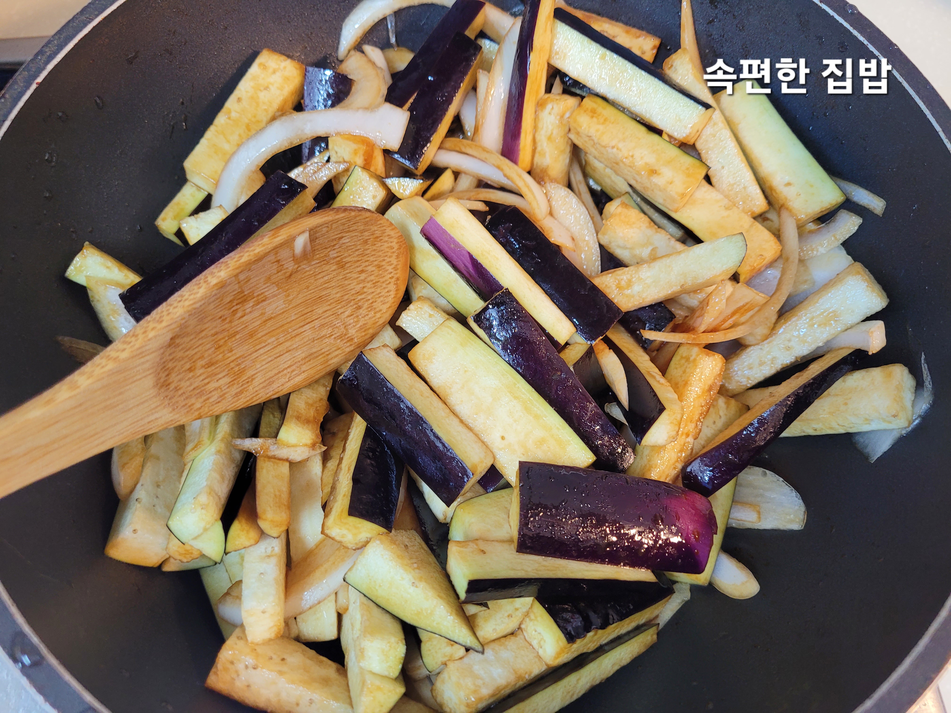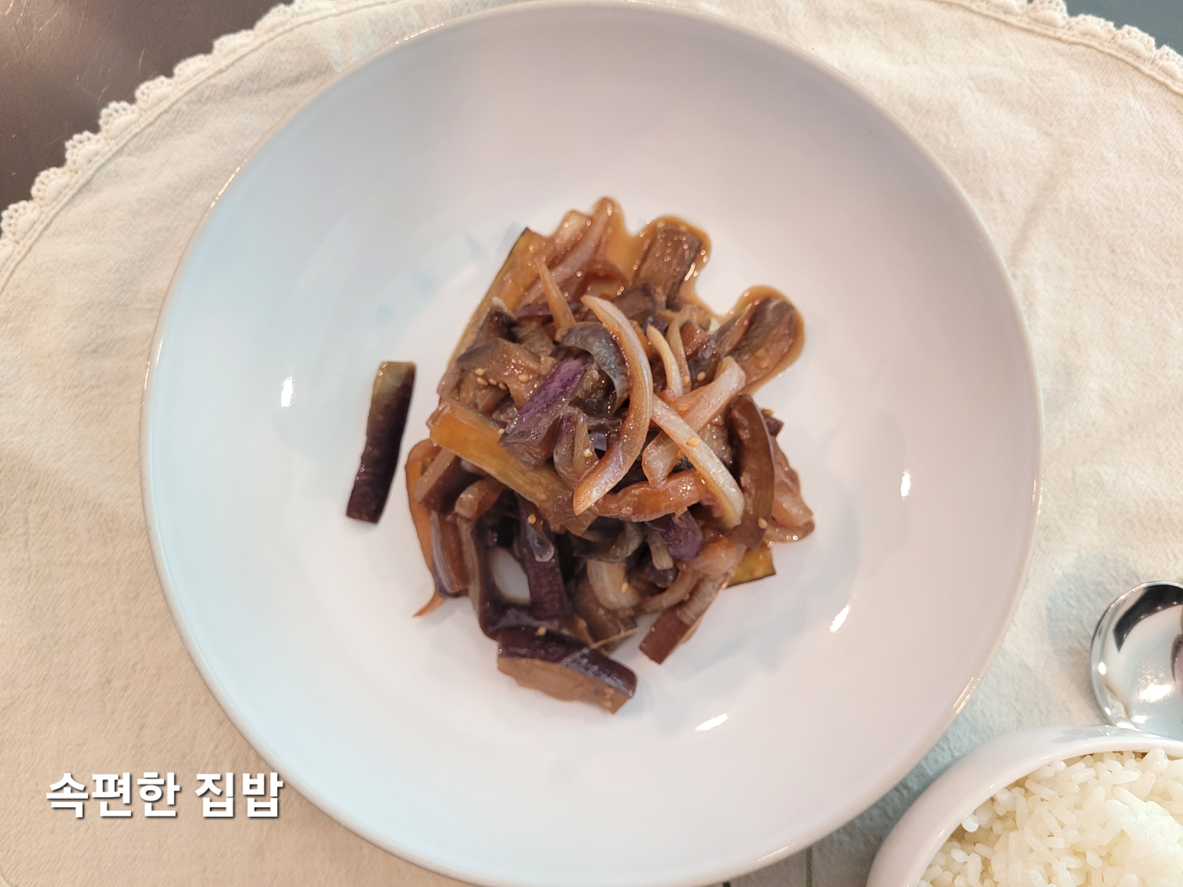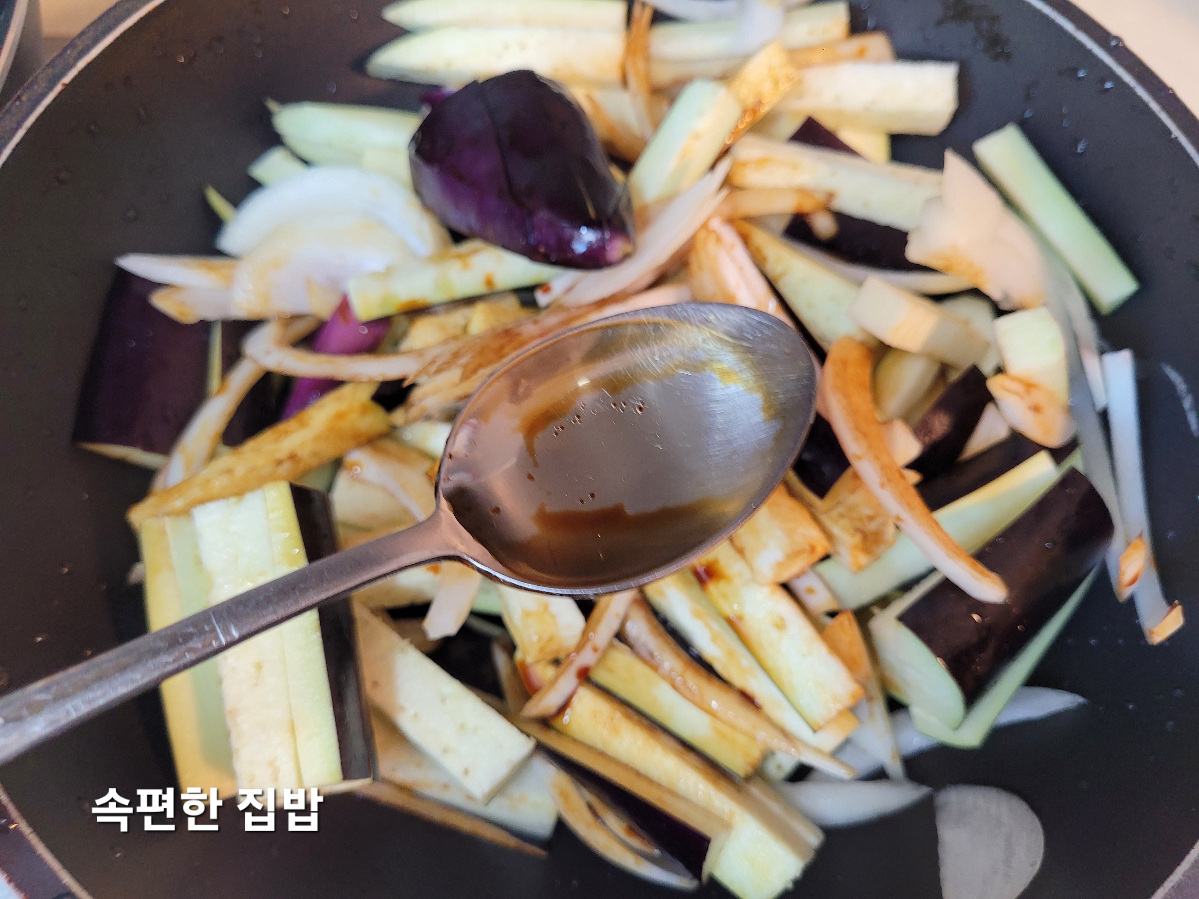 밥 위에 가지볶음 올리고 계란프라이 올려서