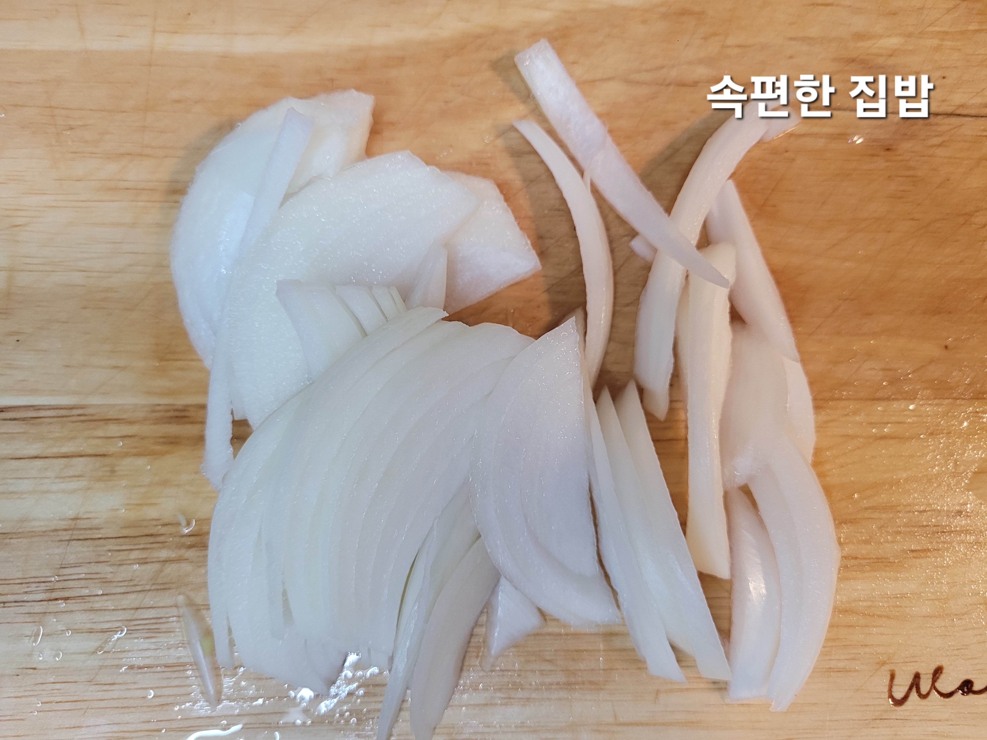 양파 반 개를 가늘게 채 썰어 줍니다.